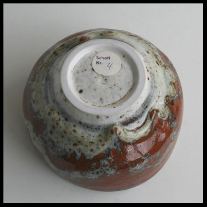 Margarete Schott wurde am 27. April 1911 in Berlin-Charlottenburg geboren. Zwischen 1947 und 1948 Töpfer mit Starkenburg Keramik in Heppenheim. Zwischen 1948 und 1951 praktische Ausbildung (Lehrwerkstätten Für Bildende Kunst) auf der Mathildenhöhe in Darmstadt. Lehrer für Keramik hier ist Fritz Theodor Schroeder. Zwischen 1951 und 1952 sie verfolgt ihre praktische Ausbildung in der Crowan-Töpferei in Praze / Cornwell mit Harry C. Davis. Zwischen 1952 und 1961 ist sie Spezialist für Glasuren an der Werkkunstschule Darmstadt. Von 1961 bis 1973 sie ist Lehrerin für Deutsch und Englisch und Geschichte. Seit 1962 sie betreibt ihr eigenes Studio in Darmstadt-Eberstadt. Im Jahr 1975 sie empfängt der Westerwaldpreis in Höhr-Grenzhausen (Glasur-Anwendung). Margarete Schott starb 2004. Abbildungen : Margarete Schott in ihrer Werkstatt, um 1980 (aus Peter Lane, Studio Porcelain); portrait Margarete Schott mit der London Gruppe in 1988; Die London Gruppe mit in der Mitte Margarete Schott in 1988; Vase (Quelle Daa-Shop via Ebay); Schale (Quelle Capriolus).