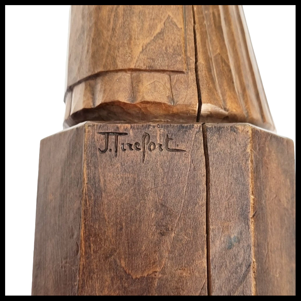 Jean Tirefort (1884-?)(FR) – holzgeschnitzte Skulptur einer Frau in schlichtem Kleid auf eingeritztem achteckigen Sockel, Höhe 30 cm, Signatur auf Sockel eingeritzt, Frankreich um 1920.