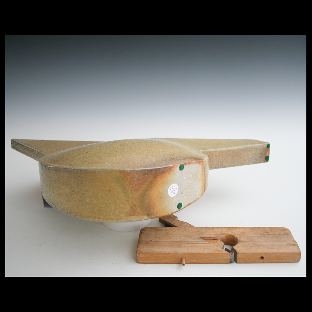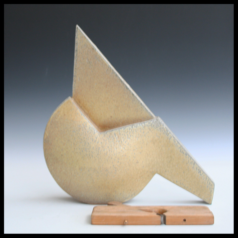 Aage Birck (DK), geometrische Skulptur, gegossener Keramikkörper, Steinzeug, salzglasiert, beigefügt ist ein Fertigteil in Form eines Handwerkerwerkzeugs, nämlich ein abnehmbarer Blockschneider, Gesamthöhe 46 cm, Breite 38,5 cm, Tiefe 11cm, 1998. Hinweis: 1 Dübel vom Blockschneider fehlt.