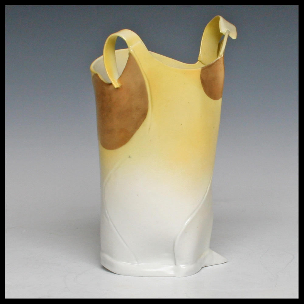 Johan van Loon (NL), Corrugated loop tube 2, Porzellan, aus dünnen Tonplatten aufgebaut, ovaler Fuß mit ‘Zehn’, oben gelb bemalt, zwei goldfarbene Flächen, drei Porzellanschleifen, Höhe 17,2 cm, Breite 13 cm, 2006. Vom Erstbesitzer in der Galerie St. Joseph in Leeuwarden erworben.