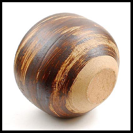 Gijb Zaalberg (NL) – eine sehr große und schwere handgedrehte Vase auf schmalerem Fuss ohne Standring, gelb brennender Steinzeugton, bemaltes Dekor in Brauntönen und Blau, ein Zeugnis großer Kunstfertigkeit, Höhe 39,5 cm, Durchmesser 43 cm, datiert 1978.