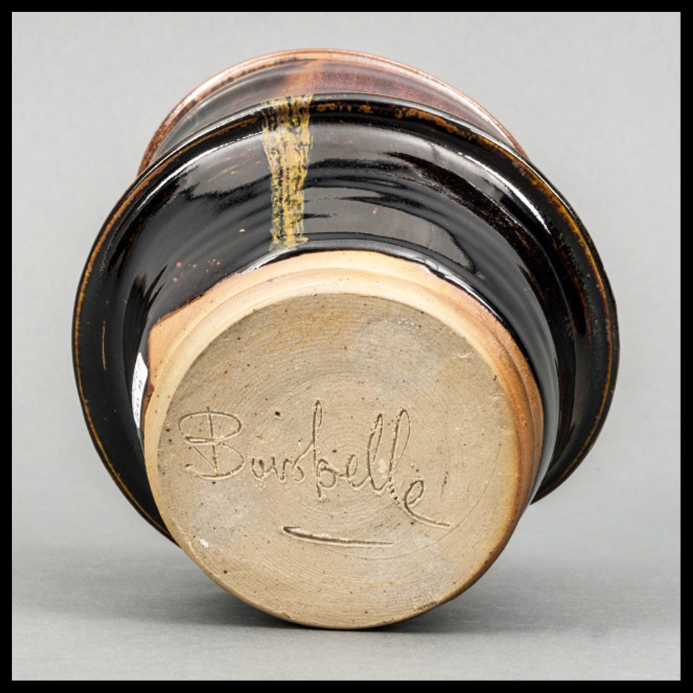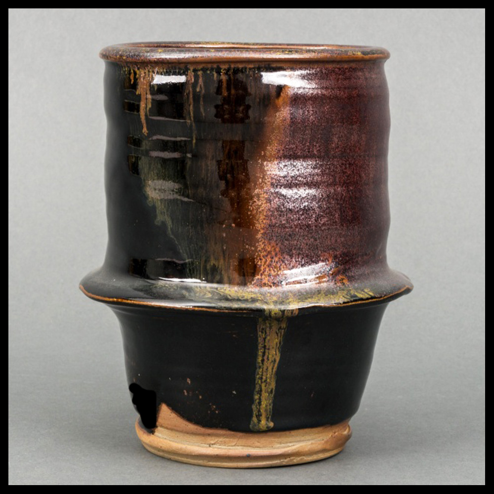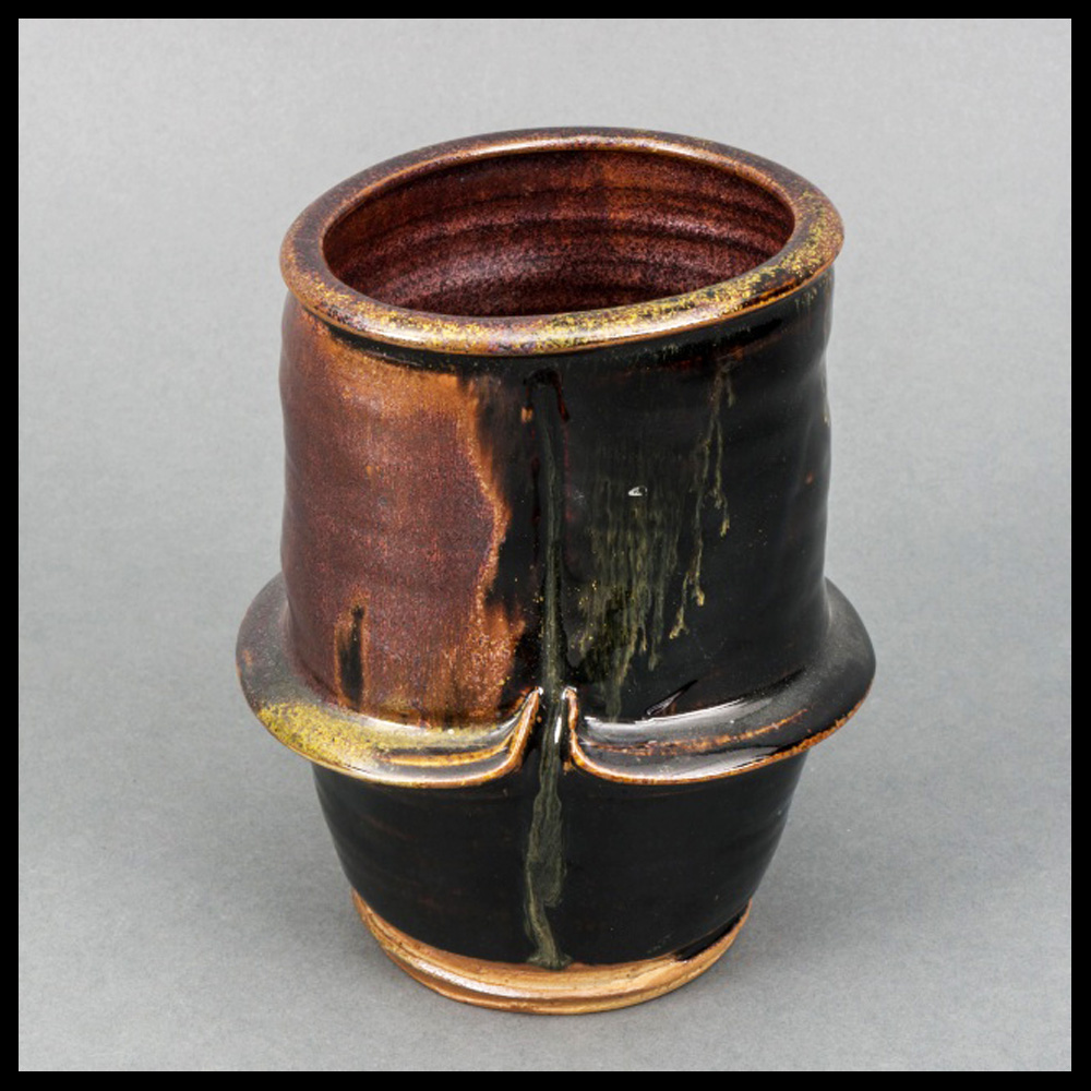 Hervé Rousseau (FR), Gefäss, handgedreht, mit deutlich sichtbaren Drehringen, zu einer ovalen Form verformt, auf halber Höhe ein Kragen, auf einer Seite eine vertiefte Rinne, Steinzeug, La Borne Holz gebrannt, mit lebhaften Brauntönen und Fließglasuren, die in der dunklen Tenmoku-Glasur enden, Höhe 18,8 cm , breiteste Breite 13,8 cm , 1980er – 1990er Jahre.