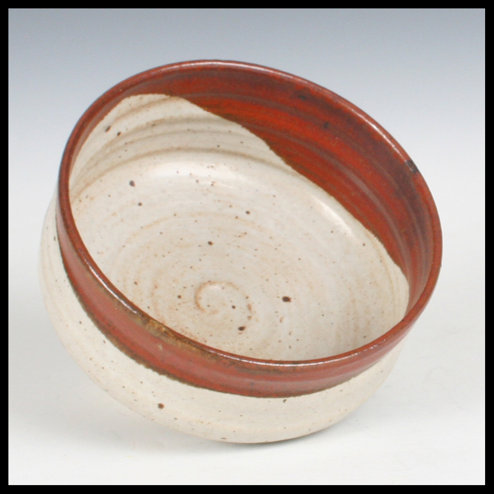 Jan de Rooden (NL), feine große Schale, auf der Scheibe gedreht, eigene Mischung aus Steinzeugton, ausgeprägte Rippen, unterer Teil der Wandung beschnitten, gedrehter Fuß, grau-weiße halbdeckende Glasur, am Rand ein welliger Streifen einer rot-braunen Glasur, aus dem Reduktionsofen in Morra (FR), Höhe 9 cm, Durchmesser 18 cm, Idol-Stempel, um 1980.