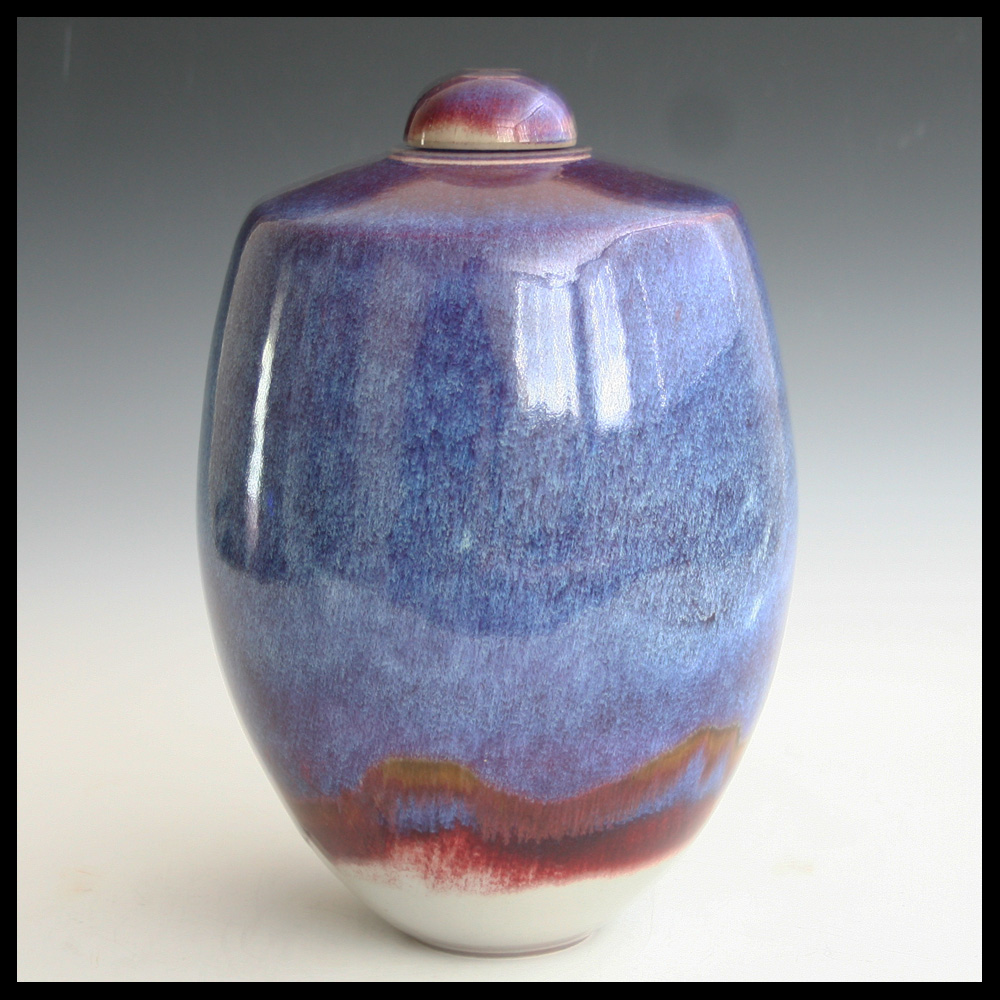 Johan Broekema (NL), monumentale Deckelvase, außergewöhnliches Exemplar von großer Kunstfertigkeit, auf der Scheibe gedreht, auf kleinem Fuß, sehr feine Fließglasuren von oben nach unten: dunkleres Blau, in helleres Blau übergehend, auf der Unterseite Streifen von Rost und Ochsenblut, die in einer transparenten Glasur auf der cremefarbenen Scherbe enden, Deckel in Ochsenblut, Höhe 32,5 cm, 1990er-2000er.