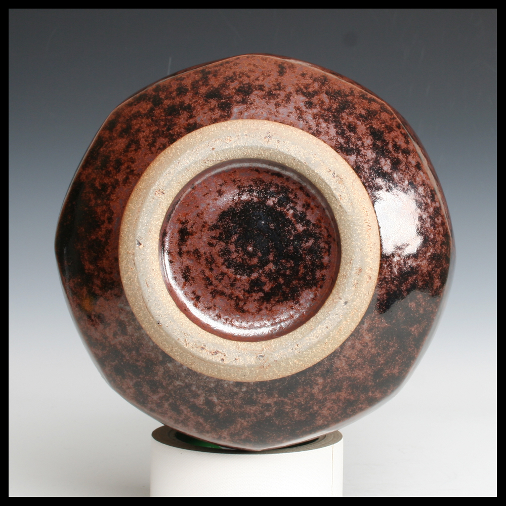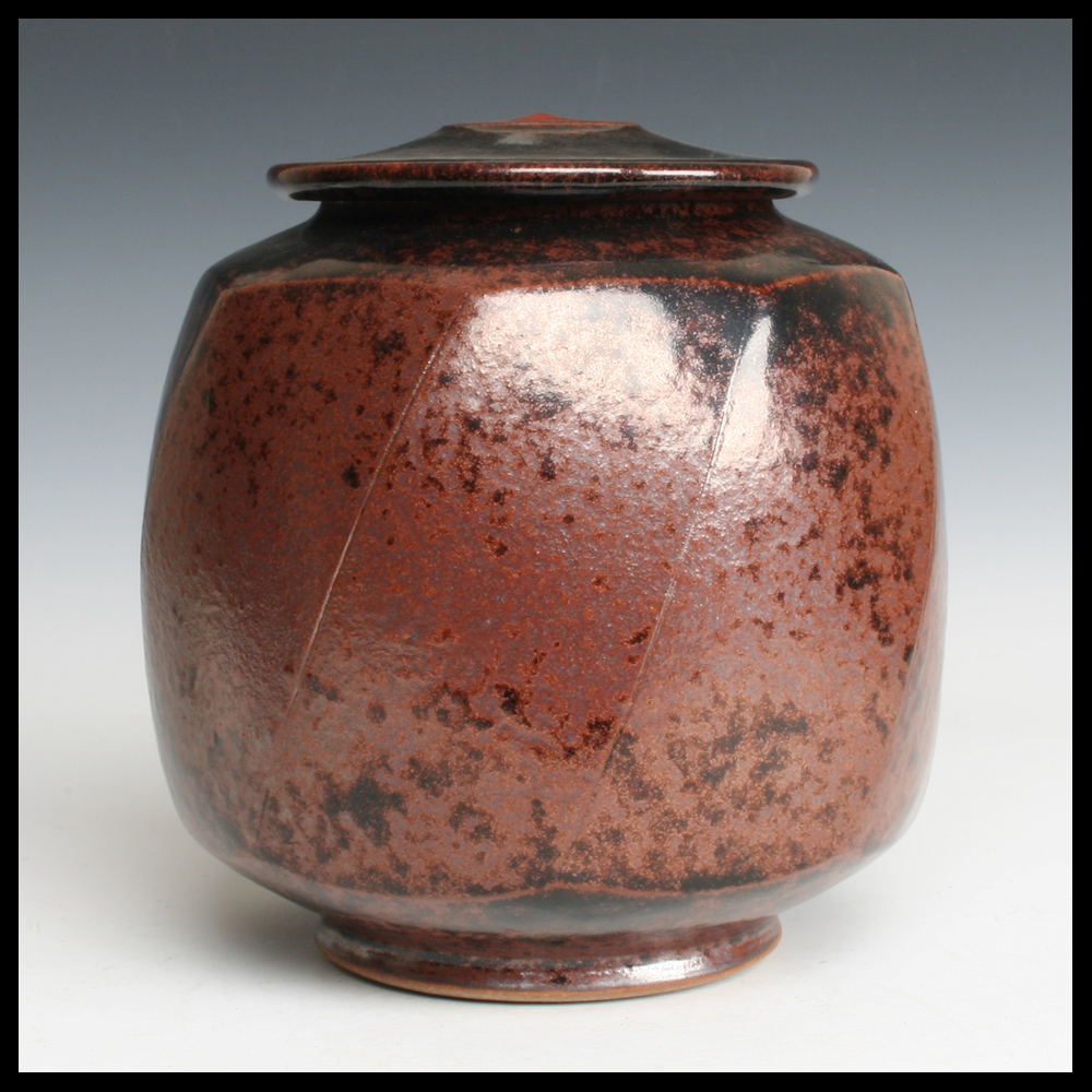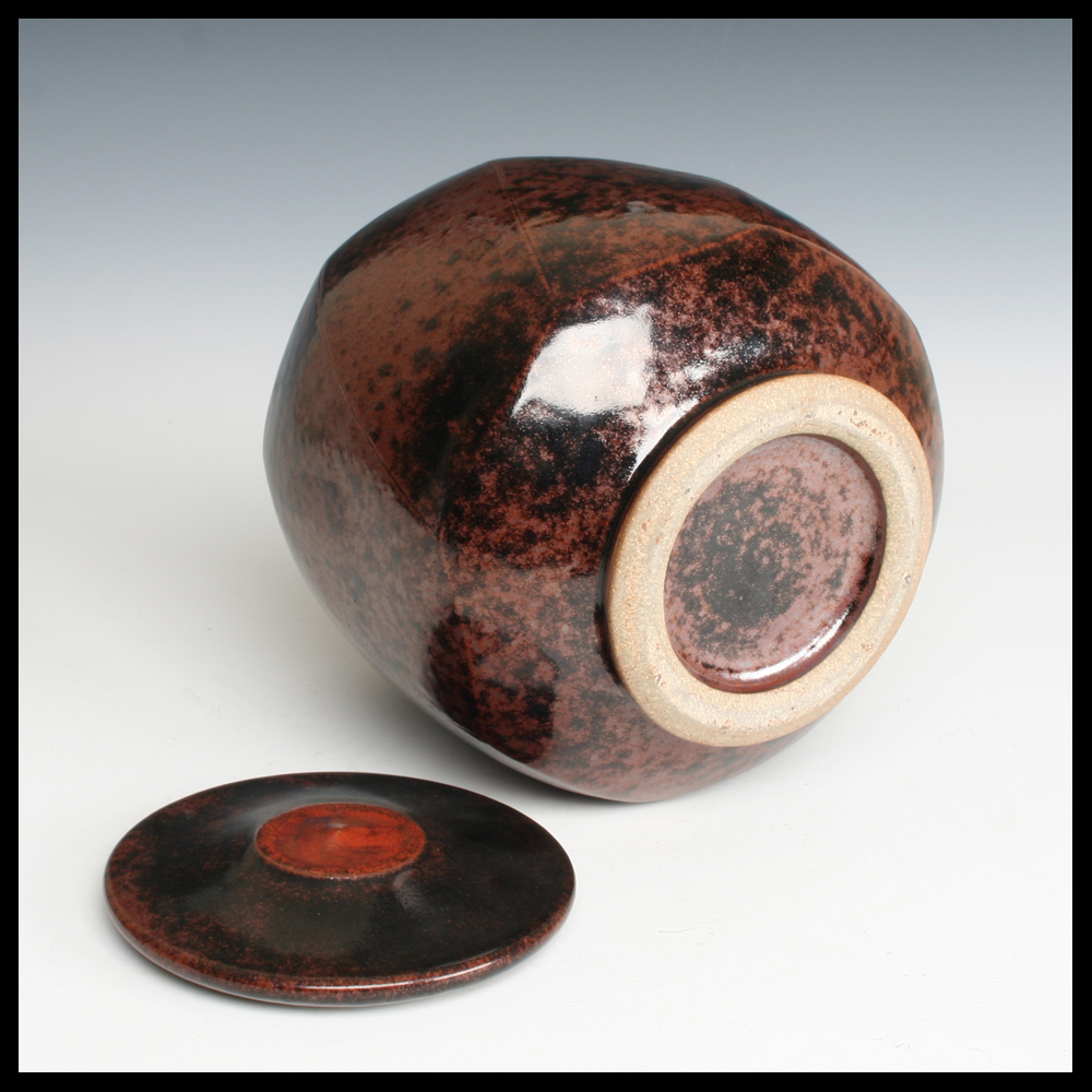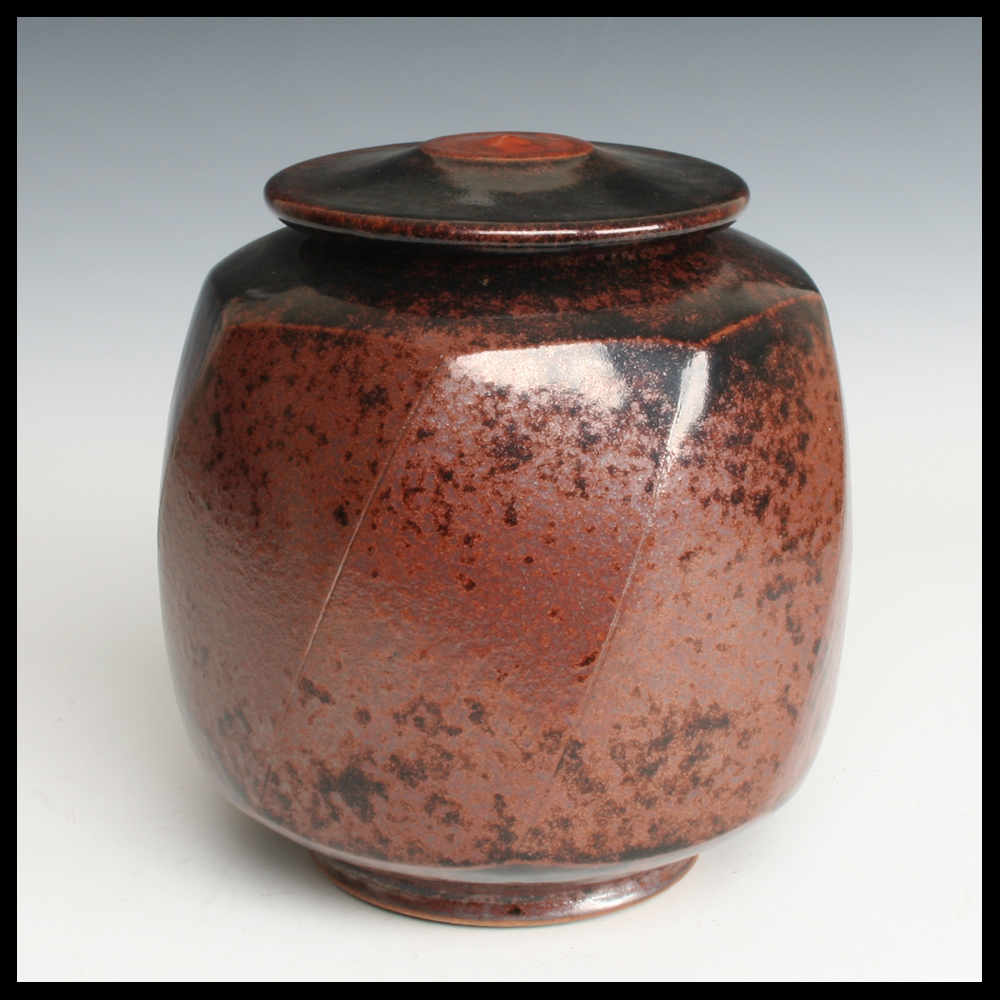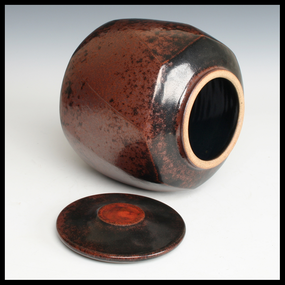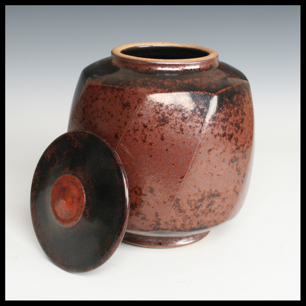 Martin Gödersmann (DE), schöne Dose mit Deckel, mit dem Hand gedreht, Steinzeug, in den Ton achteckig diagonal nach den Seiten abgeschnitten, Eisenoxide, Höhe 22 cm, wurde dieses Stück von dem ersten Eigentümer von Keramik-Galerie Bürkner im Keramion, Frechen angekauft (DE).
