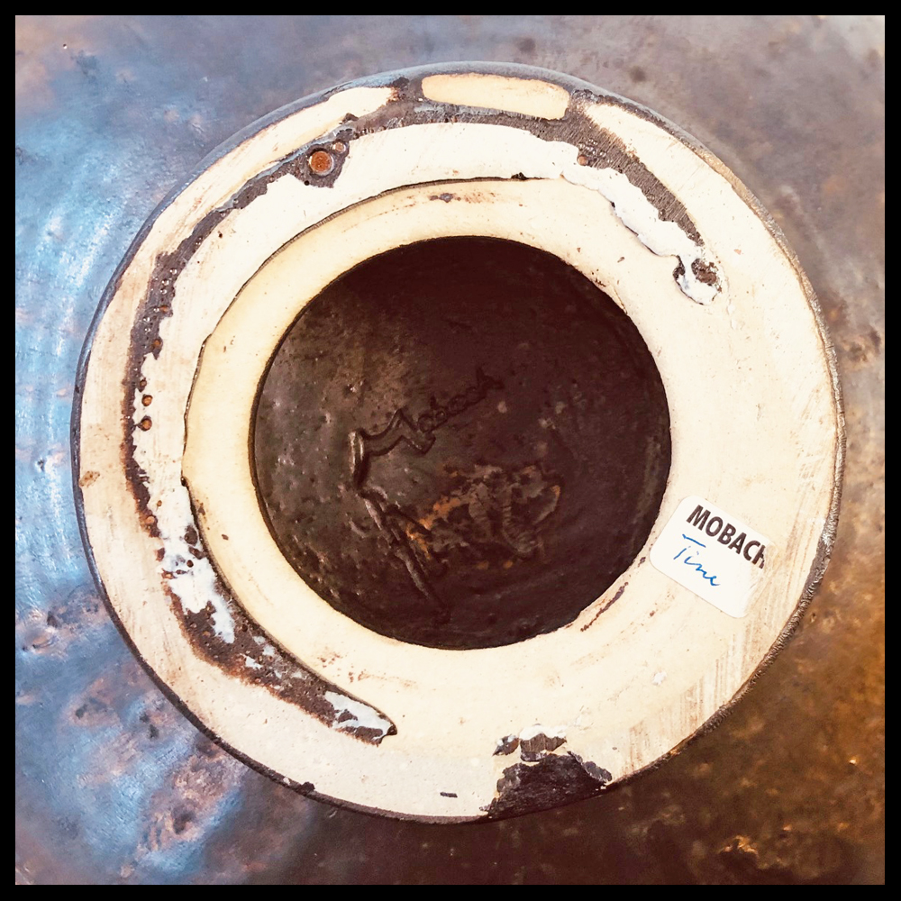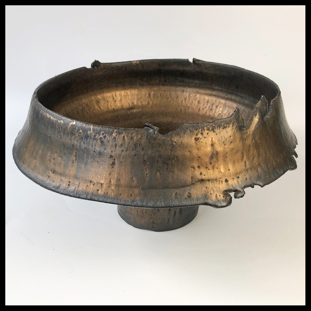 Mobach Keramiek, Utrecht (NL), einzigartige, auf der Scheibe gedrehte große, schwere Schale auf hohlem Fuß, mit ausgefranstem Rand, im Stil des britischen Keramikers Colin Pearson, weiß brennender Ton, schöne Bronzeglasur, Höhe 20 cm, Durchmesser 34,5 cm, Stempel, 1980-1990.
