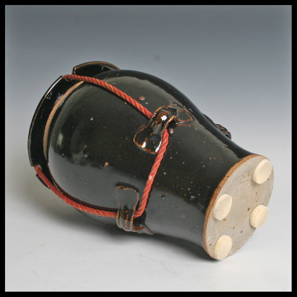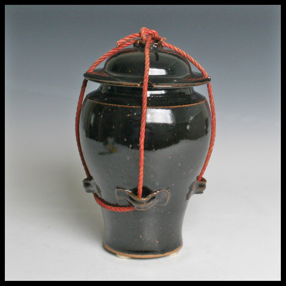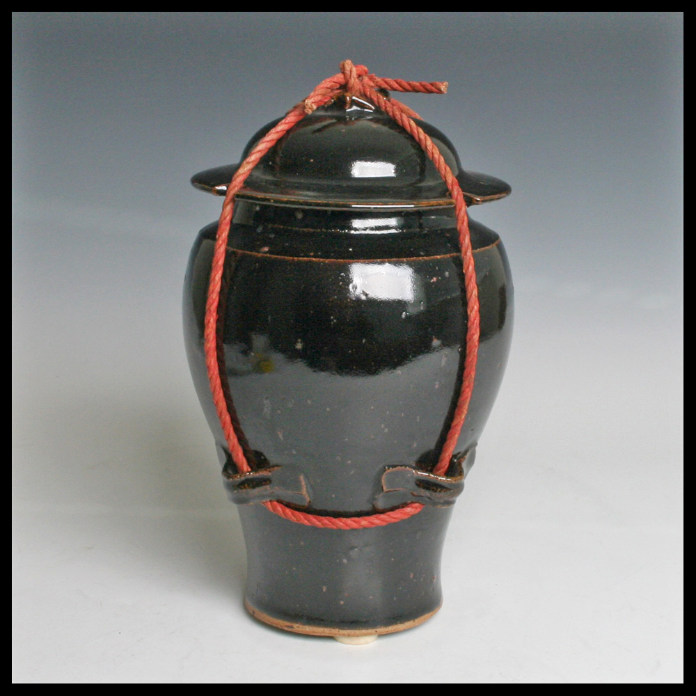 Rob Muylaert (NL), Deckeltopf im japanischen Stil, handgedreht, 4 Seillippen montiert, mit Schulter und ausladendem Deckel, Steinzeugton, dunkelbraune hochglänzende Tenmoku-Glasur, mit farbigem Papierseil um 1940, Höhe 27cm, Durchmesser 15cm, 1993-1994
