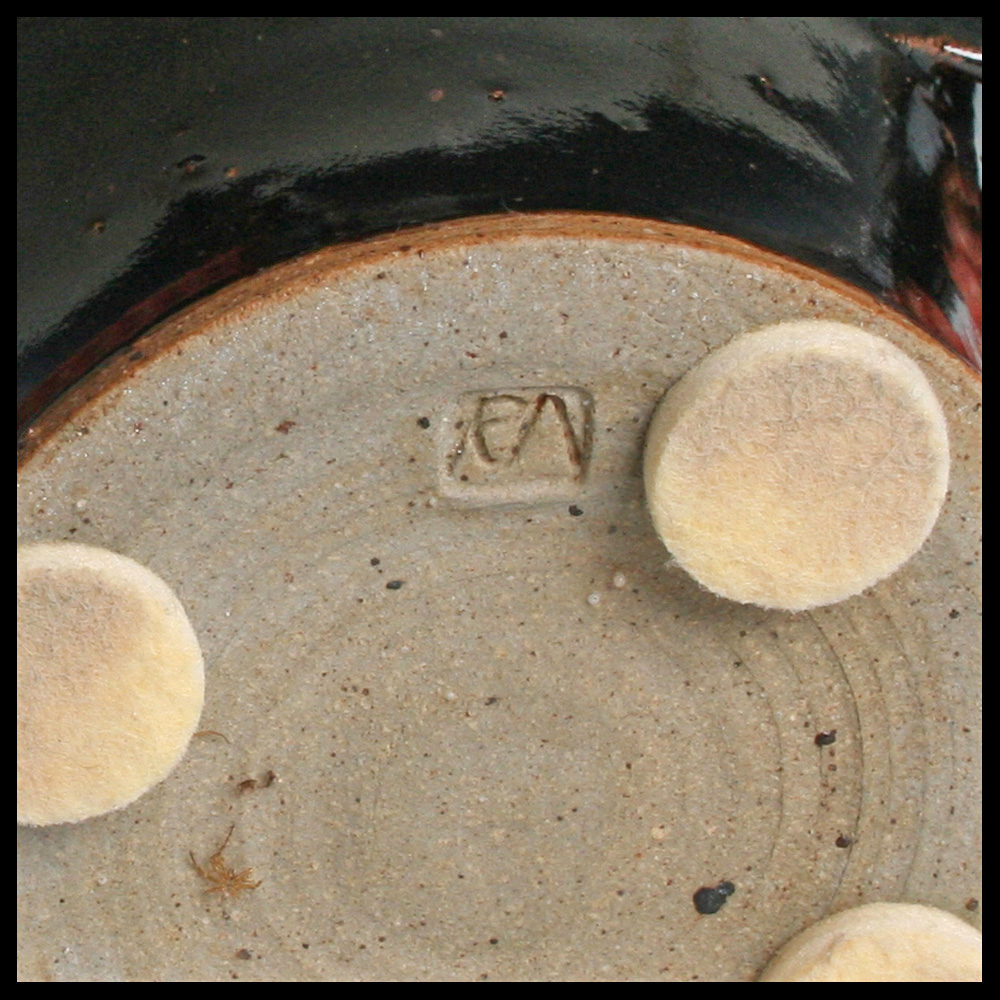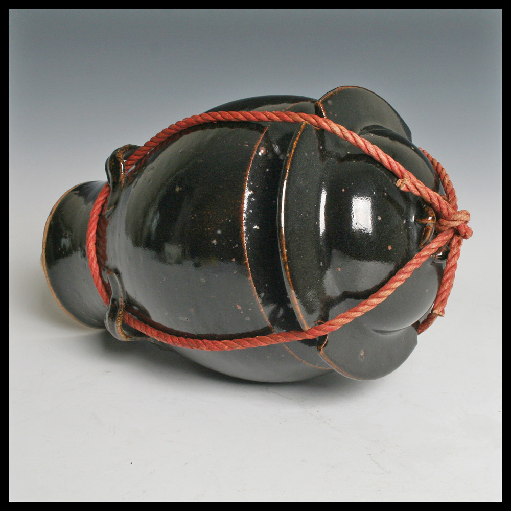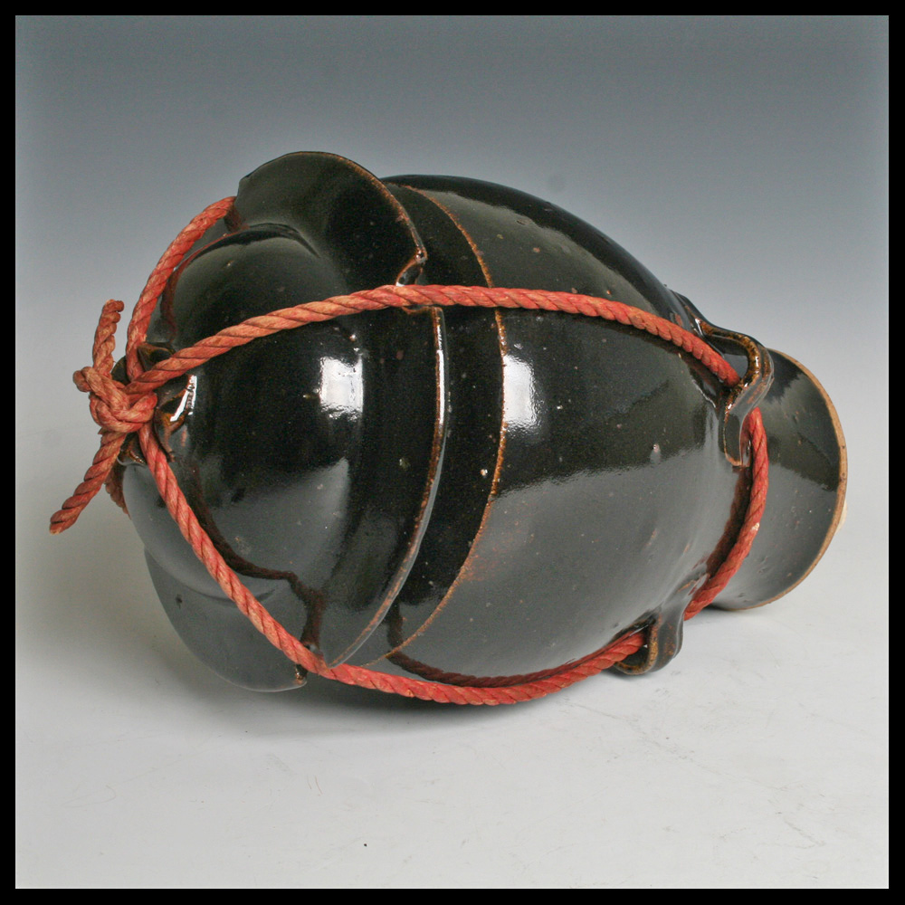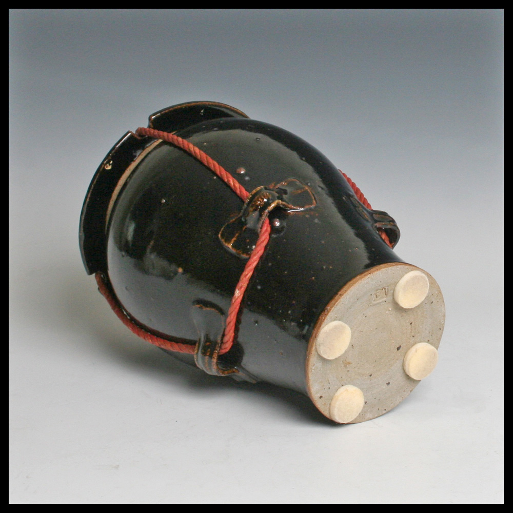 Rob Muylaert (NL), Deckeltopf im japanischen Stil, handgedreht, 4 Seillippen montiert, mit Schulter und ausladendem Deckel, Steinzeugton, dunkelbraune hochglänzende Tenmoku-Glasur, mit farbigem Papierseil um 1940, Höhe 27cm, Durchmesser 15cm, 1993-1994