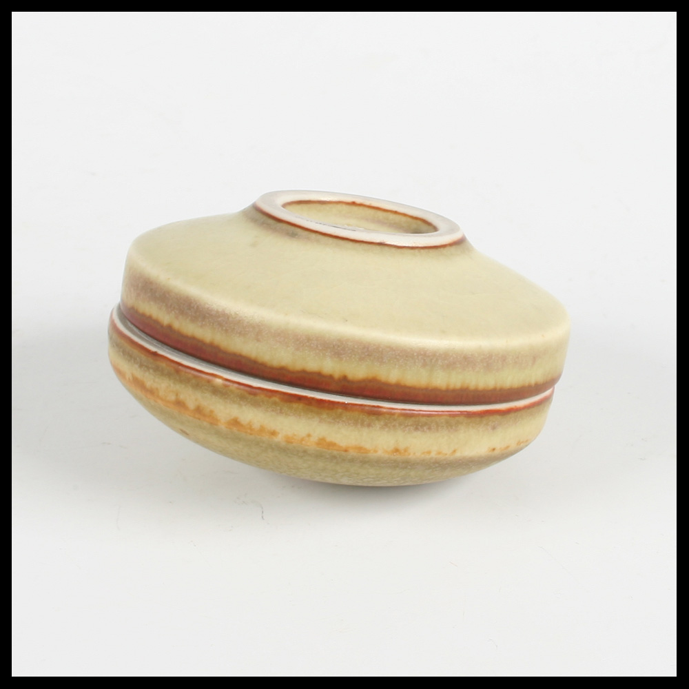 Ursula Scheid (DE), eine elegante kleinen Deckeldose, Handgedreht, Porzellan, ockerfarbigen Glasur, unten helleres gelb, braunen Rand nur auf der unteren Hälfte, Höhe 5 cm, 7,5 cm Durchmesser, 1971.