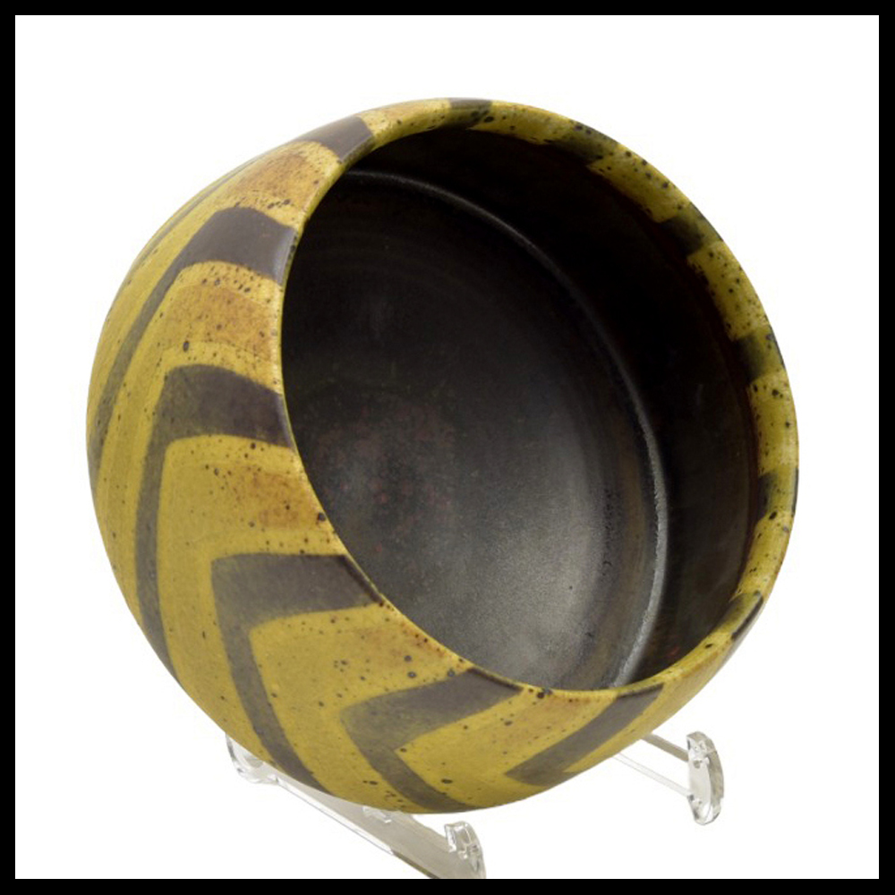 Ursula Scheid (DE), sehr große, breite, “schwebende” Schale auf abgedrehtem kleinem Fuss, auf der Scheibe gedreht, innen bronzefarbig, breite diagonale, leicht nach innen gearbeitete Schrägbänder über dem Rand, Höhe 12,5 cm, Durchmesser 24,5 cm, 1988. Dieses Objekt wurde von seinen ersten Besitzern in der Galerie Amphora in Oosterbeek (NL) anlässlich der Ausstellung Sechs deutsche Künstler , Kat. Nr. 27, erworben.