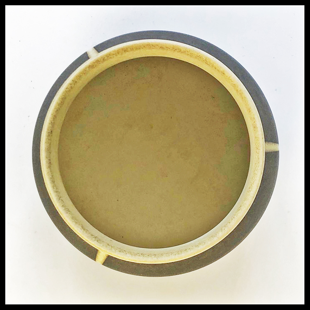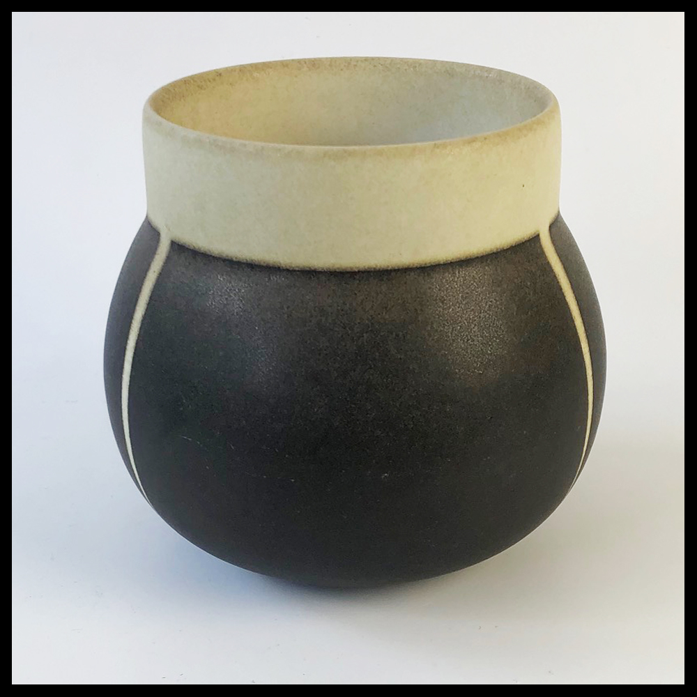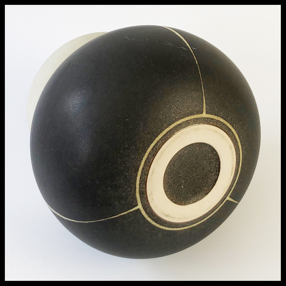 Uwe Lerch (DE), kräftige Kugelschale, der breite obere Rand in der Farbe der Weißbrandscherbe, über dem Bauch drei vertiefte, sich nach unten verjüngende Leisten, schön gearbeitete Unterseite, Höhe 13,2 cm, Durchmesser 14,7 cm, Künstlerstempel UL, 1990er Jahre.
