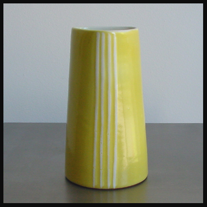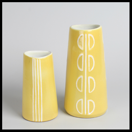 Potterie De Haemstede hat im Nachkriegsperiode diese mit dem Hand gedrehte, gelbe Vasen produziert. Weisses Blattmotiv oder vertikaler Streifen. Amsterdammer Periode. Geprägt am Unterseite ‘haemstede’. Diese Vasen sind sehr wahrscheinlich exclusive verkauft worden im Kaufhaus De Bijenkorf in Amsterdam. Preisen der einzele Vasen sind: mit Blattmotiv (0623) € 65,00; mit vertikaler Streifen (0872) € 50,00.
