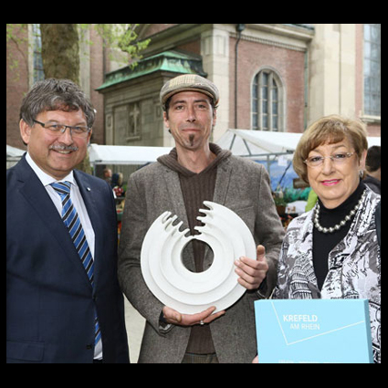 Frank Schillo – (DE) – Gefäss, unikaat, eine mit dem Hand aufgebaute Ringform, Steinzeug, glasiert in eine creme-weisse Glazur. In 2007 hat Frank Schillo mehere Ringformen hergestellt. Sehe auch den Abbildung wo Schillo eine Variant zeigt während eine Pottbaeckersmarkt. Dieses Stück würde gekauft während eine Ausstellung im Emslandmuseum, Schloss Clemenswerth in Sögel (DE) in 2007. Die Text im Brochure lautete:’” Elemente der Konstruktion und der Statik, Kannelüren, Bogengrate wie auch Rippen- und Rillenrapporte zwischen konvex und konkav schwingenden Flächen bilden das klare Gestalltungsprinzip im keramischen Werk von Frank Schillo, in dem die Grenzen zwischen Gefäss, Object und Skulptur fliessend sind: Ergebnis ist eine neue Ästhetik.”