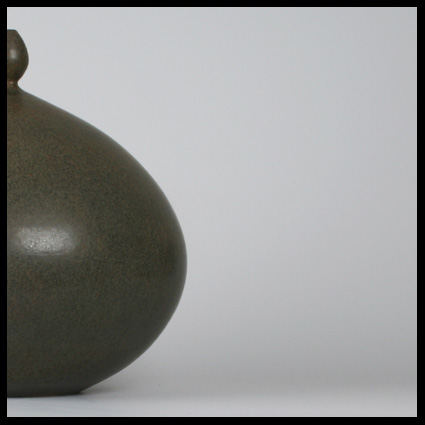 Geert Schreuder (Nimwegen/NL): in dieser grosse Vase Plastik erkennen wir einerseits die Kunstfertigkeit der Töpfer Geert Schreuder und andererseits die Spannung in diesem Objekt, herbeigeführt durch der Künstler Geert Schreuder. Eine Vase Plastik der plumpen beginnt aber endet in einen äußerst eleganten Weg, in einem fast geschlossenen Knopf auf eine geschlossene Form. Das Objekt hat eine schöne matt glänzend rostig-grün Hareskin-Glasur.