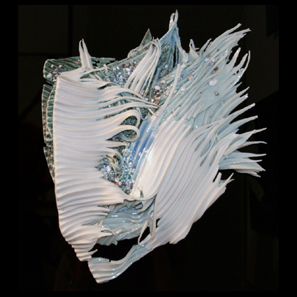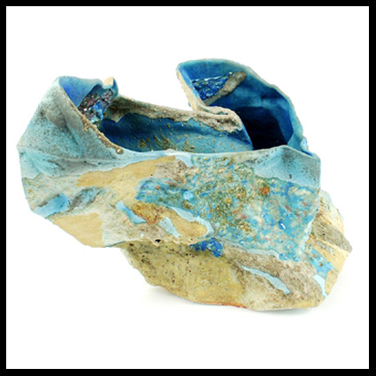 Texture has always been important in her work. In the asymmetrical vessels from the mid 1990s, texture and colour were added on to the surface in a gestural manner that suggested the landscape of Cornwall. In the work from the Imerys’ residency, texture was integral through the incorporation of clay granules, found grasses and weeds that left their trace after firing. In her new works, texture is impressed into sheets of clay from tree bark and taken back to the studio to be transformed. This technique is the result of a search for an artistic vocabulary that removed the artist from complete control of the image.