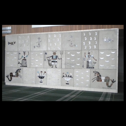 Pierre Caille is born in Tournai / Doornik in Belgium on January 11, 1911. In 1931 he starts his study at Ecole nationale supérieure d’Architecture et des Arts décoratifs La Chambre in Brussels. He starts as a painter. In 1936 is his first contact with ceramics, following the advices of Henry Van de Velde. In 1937 he designs theatre decorations and jewellery in gold and silver. In 1941 he opens his first ceramic studio. In 1949 he creats his first ceramic mural. In 1953 he delivers huge ceramic pieces for the casino of Oostende. Caille dies in Brussels on October 24, 1996. Pictures : Pierre Caille (source Bastien Art Gallery Brussels); Pierre Caille portrait (source lavenir.net); ceramic piece (source modernist50.blogspot.com); tilepanel in Casino Ostende, 1953 (sculpturs 2010_skyrock).