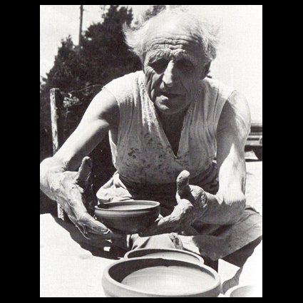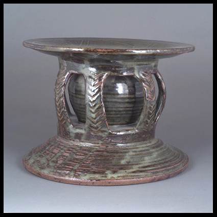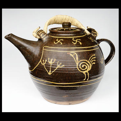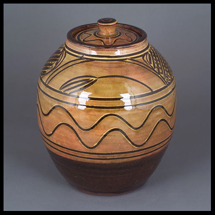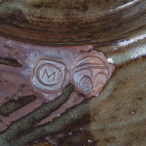 Michael Cardew is born in Wimbledon, London in 1901. He is the fourth child of Arthur Cardew, a civil servant, and Alexandra Kitchin, the eldest daughter of G.W.Kitchin,  the first Chancellor of Durham University. His family has a holiday home in North Devon, where Arthur Cardew collected Devon country pottery. Cardew first saw this pottery being made in the workshop of Edwin Beer Fishley at Braunton and learned to make pottery on the wheel from Fishley’s grandson, William Fishley Holland. He gained a scholarship to read Classics at Exeter College, Oxford. Already preoccupied with pottery, he graduated with a third class degree in 1923. Cardew was the first apprentice at the Leach Pottery, St.Ives, Cornwall, in 1923. He shared an interest in slipware with Bernard Leach and was influenced by the pottery of Shoji Hamada. In 1926 he left St Ives to restart the Greet Potteries at Winchcombe in Gloucestershire. With the help of former chief thrower Elijah Comfort and fourteen year-old Sydney Tustin, he set about rebuilding the derelict pottery. Cardew aimed to make pottery in the seventeenth century English slipware tradition, functional and affordable by people with moderate incomes. After some experimentation, pottery was made with local clay and fired in a traditional bottle kiln. Charlie Tustin joined the team in 1935 followed in 1936 by Ray Finch, who bought the pottery from Cardew and worked there until he died in 2012. The pottery is now known as Winchcombe Pottery. Cardew married the painter Mariel Russell in 1933. They had three sons, Seth (b. 1934), Cornelius (1936-1981) and Ennis (b. 1938). In 1939, an inheritance enabled Cardew to fulfill his dream of living and working in Cornwall. He bought an inn at Wenford Bridge, St Breward, and converted it to a pottery, where he produced earthenware and stoneware. He built the first kiln at Wenford Bridge with the help of Michael Leach, Bernard Leach’s son. It was fired only a few times before the outbreak of war, when blackout restrictions brought work to an end. In 1950 an Australian potter, Ivan McMeekin, became a partner and ran the pottery while Cardew was in Africa. McMeekin built a downdraught kiln and produced stoneware there until 1954. Wenford Bridge Pottery did not make enough money to support Cardew and his family, and in 1942 he accepted a salaried post in the Colonial Service as a ceramist at Achimota School, an élite school for Africans in the Gold Coast (Ghana). Although Cardew’s main motivation for taking the post was financial, he had become convinced (partly though his reading of Marx) that there should be a closer relationship between the studio potter and industry. In 1945 Cardew moved to Vumë on the River Volta where he set up a pottery with his own resources. He struggled with difficult clay and kiln failures for three years and later judged the Vumë pottery to have been unsuccessful, but its products are among his most highly regarded pots. He returned to England in 1948 and made stoneware pottery at Wenford Bridge. In 1951 he was appointed by the Nigerian government to the post of Pottery Officer in the Department of Commerce and Industry, during which time he built and developed a successful pottery training centre at Abuja in Northern Nigeria. As a result of Cardew’s extensive contact with and admiration of African pottery, his later work shows its influence. He returned to Wenford Bridge on his retirement in 1965. Through his contact with Ivan McMeekin, in 1968 he was invited by the University of New South Wales to spend six months in the Northern Territory of Australia introducing pottery to the aborigines. He travelled in America, Canada, Australia and New Zealand, making pots, demonstrating, writing and teaching. He wrote Pioneer Pottery , an account of pottery-making based on his experiences in Africa, which assumes that the potter will have to find and prepare his own materials and make all his tools and equipment, and an autobiography, A Pioneer Potter. Bernard Leach said that Cardew was his best pupil. He has been described as “one of the finest potters of the century and one of the greatest slipware potters of all times.” The decorative style of his slipware is usually trailed or scratched and is free and original. The stoneware he made at Vumë and Abuja is similarly well regarded. There are collections of his work in museums in Britain, the United States, Australia and New Zealand. He was appointed MBE in 1964 and OBE in 1981. He was due to be knighted at the time of his death. He died in Truro in 1983 (text from Wikipedia.org). See Michael Cardew in a movie dated 1984 (source You Tube): https://www.youtube.com/watch?v=mKqoCcg0jek Pictures : Portrait 1936 (source IMAGNO-Austrian Archives); portrait 2 and 3 (source: Michael Cardew -see Bibliography); large teapot, 1930s (source: collection vads.ac.uk); lidded jar, ca. 1938 (source: MAAK Auction London); rare stool, 1970s (source: MAAK Auction London); early signature (source: studio pottery.com); signature 1970s (source: MAAK Auction London).