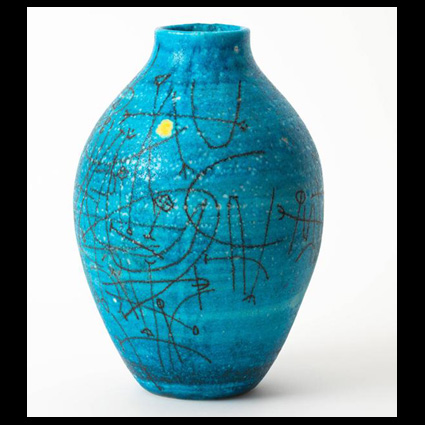 Guido Gambone is born in Montella, province of Avellino in Italy on June 27, 1909. He moves in his childhood with his parents to Vietri. After finishing high school he began his relationship with ceramics, working at the factory “Avallone” , owned by Don Ciccio Avallone, first as an apprentice, then as a painter and then Chief painter. He completed his education at the “M.A.C.S.” (Artistic Ceramics Manufactory Salernitana) in properties, such as “I.C.S.” (Industria Ceramica Salernitana), where he works a few years. Working at these factories came into contact with the so called “German potters colony” active at Vietri (Richard Dolker, Irene Kowaliska, etc.) assimilating the style. Attentive to all artistic changes of his time very young approaches the current Valori Plastici. In 1930 he was invited to exhibit her ceramics, made to manufacture “Avallone”, at the Milan Triennale. In 1933, due to a serious car accident suffered amputation of a limb. Around the mid-thirties his interest turns to the new Roman painters Group composed of Corrado Cagli, Capogrossi and Emanuele Cavalli. In 1935 he was Artistic Director at the I.C.S. “and in 1936 was transferred, along with Vincenzo Procida and Francesco Solimene, in Florence at the factory for the production of artistic ceramics” Cairo “with which Melamerson signed an agreement of collaboration. In the same year he married Concetta Pierro. At the “Cairo” carries Vietri-style production but strongly influenced by the metaphysical paintings of Massimo Campigli and Noucentisme Gio Ponti. Enriched by the Florentine experience and influenced by research on plastic and glassy glaze colourism of Max Laeuger, in 1939 back to Vietri, to manufacture “I.C.S.” and here comes into contact with the ceramist sardo Melchiorre Melis remaining uninfluenced . In the 1940s, opened a small Manufactory in right but the war stops abruptly. In the immediate postwar years Guido Gambone, together with his brother Remigio and friend Andrea D’arienzo founded a ceramics Manufactory with name “Faenzarella” and, aside from the ceramic art, began to produce simple artifacts, devoid or nearly decorum and intended to replace the indispensable Cookware lost during the war. With the “Faenzarella” works in those years also Vincenzo Procida. At the same time, in order to survive, are working in Marina di Vietri at ex Melamerson factories taken over by Negri. Slowly the “Faenzarella” back to produce ceramic art getting a slow but growing success and in the years 1947 and 1948 some artifacts made by Gabriel under the brand of “Faenzarella” (a donkey) take part, winning, at Faenza prize. In 1947, with the ceramic Panel the Republic of Italian workers, WINS for the first time the Faenza Prize, prize that he was awarded in 1948, with bowl with ornate abstract, ex aequo with a flask of Anselmo Bucci in ‘ 49, with the flask entitled La faenzar Ella, in ‘ 59 with Cup and vase graffito and in ‘ 60 with plastic shape and rust brown and Brown and white vase. It is shown that cooperation, in recent years, Guido Gambone with “Bagiardi Furnaces” in San Giovanni Valdarno (AR) In 1949 gets the first prize at the Premio Nine banished by Ente Fiera di Vicenza. In 1950 Gabriel he moved permanently to Florence and, together with his friend Andrea D’arienzo and after a stint at “Cairo” where sports production some works inspired by the production of Ponti, founds the company “Tirrena”, with which also collaborate Vincenzo Procida, Luli Moriondo and the son of Guido, Bruno Gambone. In 1950 he was invited to exhibit some of his works, including a plate entitled Madonna and child, the Italian handicraft exhibition at the Brooklyn Museum in New York and that same year he participated, not competing, the Faenza prize. In 1951 he presented his first solo show at Galleria Il Milione in Milan. In 1959 is the first prize in the competition of Faenza, in 1960 gets a gold medal at the Biennale della Ceramica in Gubbio and in 1962 he won the first prize in the competition of Gualdo Tadino. The company remains in effect until 1967. Painter, sculptor and ceramist Guido Gambone died in Florence in 1969. (texst: www.archivio ceramica.com)