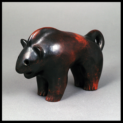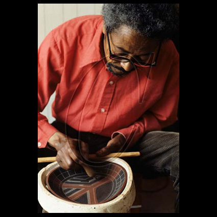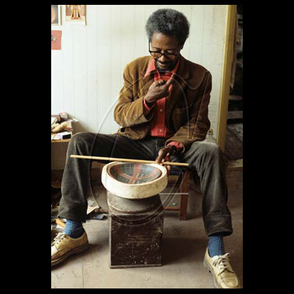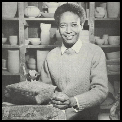 Siddig el Nigoumi is born in Sudan (Africa) in 1931. He claimed he enjoyed playing with mud on the banks of the river Nile and this is what gave him an interest in pottery. He trained at Khartoum Art School (1952-1955) and became a calligrapher. He studied in London shortly after at the Central School of Art and returned to Sudan to teach. As a teacher at Khartoum, he encouraged his students to look towards their own culture and traditions, often bringing his classes to analyse shapes at the Ethnographical Museum. He settled in England permanently in 1967 finding it a more creative environment. He continued to teach in the UK and featured in the Aberystwyth Ceramics festival in 1987. He threw mainly stoneware pots as well as using traditional African techniques such as burnishing and the colours of Nubia House decoration. He used charity shop bought knitting needles to score designs on his pots that often display his calligraphic skills and incorporate British graphic designs that interested him such as the Guardian Crossword, CND or Rolls Royce Logo. His signature is a symbol of a scorpion, a reminder of his home in the desert. Siddig died in 1996 (text: ceramics-aberystwyth). Pictures : portrait 1974 (source West Surrey College of Art & Design); two portaits 1983 (photographer Ben Boswell); animal 1982 (MAAK Auction London); drinking vessel 1988 (source Bonham’s London).