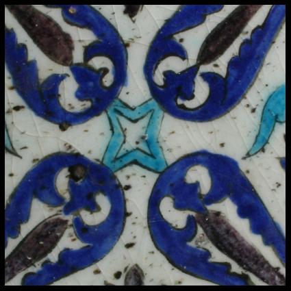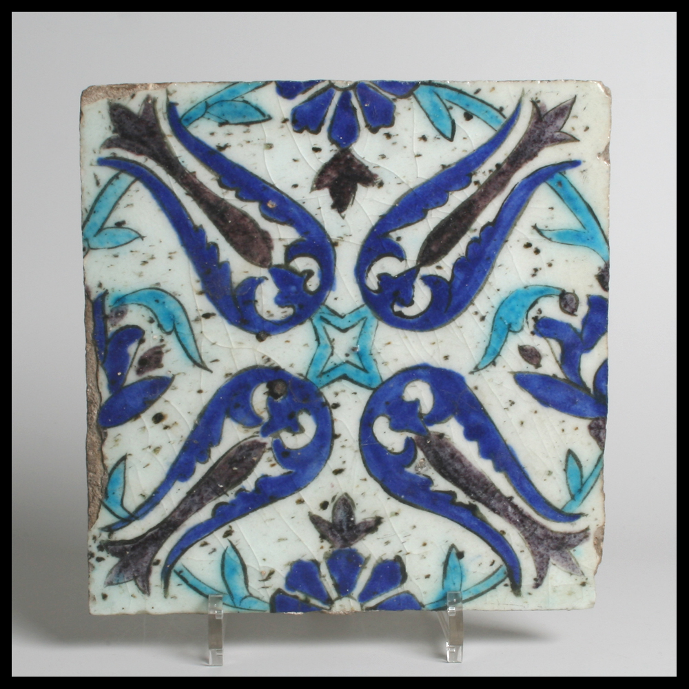 A Damascus pottery tile, Ottoman Syrië, 17th century, four tulips framed by roses and lotuses.