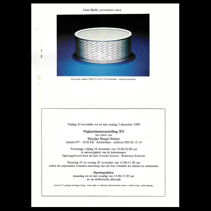 Marijke Biegel-Sträter (1929-2008) was samen met Toos de Klerk galeriehouder voor Galerie De Proen (1979-1981). Nadat deze galerie ter ziele was heeft Marijke de draad weer opgepakt en ging vanaf 1984 verkoopexposities van kunstenaars aan huis organiseren. Aanvankelijk vanuit haar huis Keizersgracht 318 II en vanaf 1989 vanuit het pand Amstel 87 I. Marijke stopt haar activiteiten in 1996. In de galerie werd werk aangeboden van o.a. Hein Severijns, Johan Broekema, Netty Janssens en Leen Quist (1989). Afbeeldingen : Pand Amstel 87 I, Amsterdam, hier was de galerie gevesigd vanaf 1989 (bron Stadsherstel Amsterdam); aankondiging najaarstentoonstelling XV met werk van Leen Quist, 1989 (bron Archief Capriolus).