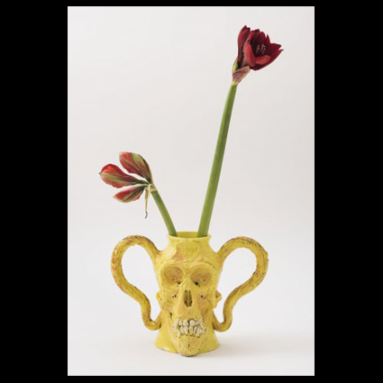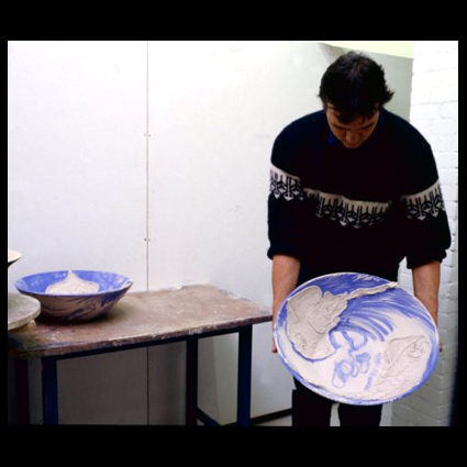 Erik Bart Andriesse is geboren te Bussum op 17 juni 1957. Erik volgt een opleiding bij Ateliers ’63 te Haarlem van 1975 tot 1977. In 1982 werkt hij enkele maanden in het atelier van A.R. Penck in Schloss Lörsfeld. Tussen 1983 en 1993 woont en werkt hij in Amsterdam. In 1988 wint hij de Prix de Rome (eerste prijs grafiek). In 1992 maakt hij schetsen in Artis. In de zomer en het najaar van 1992 beschildert hij een groot aantal voorgevormde vazen en borden in het atelier van de keramist Norman Trapman. Het werk is qua thematiek en kleurgebruik nauw verwant aan zijn tekeningen en schilderijen. Kort hierop wordt hij door het Stedelijk Museum ‘s-Hertogenbosch – toen nog Museum Het Kruithuis geheten – uitgenodigd om in het Europees Keramisch Werk Centrum (EKWC) in Den Bosch te komen werken. Hier verblijft Andriesse in de eerste maanden van 1993. In het EKWC ontstaan de meer sculpturale vazen en kommen. Andriesse laat zich hierbij inspireren door de natuur, Japanse keramiek en de keramiek van Picasso. Geel is een van zijn favoriete kleuren glazuur. Na twee maanden breekt hij zijn verblijf af. Enkele weken later op 23 maart 1993 overlijdt Erik op 35-jarige leeftijd te Amsterdam. Hij is begraven op Zorgvlied (Graf N-III-0859). In 2015 organiseert het Stedelijk Museum ‘s-Hertogenbosch de expositie Erik Andriesse: de onbekende keramiek . In deze expositie wordt voor het eerst het keramische oeuvre van de jong gestorven kunstenaar getoond. Andriesse is graficus, schilder, beeldhouwer en keramist. Hij signeert met Eric Andriesse of Erik Andriesse. Afbeeldingen : Portret (bron RKD Den Haag); Erik in zijn atelier (bron Catawiki); Erik met een werkstuk, najaar 1992 (bron SM’ s Den Bosch, foto EKWC); doodskopvaas (foto Peter Cox); schaal (bron SM’ s en Bosch).