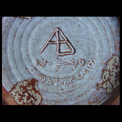 Annie Wilhelmina de Boer is geboren te Amsterdam op 1 april 1916. Zij woont op adres Sluisstraat 56-1 te Amsterdam. Haar vader is de edelsmid Ch. A. de Boer. Annie begint in het schooljaar 1936-1937 de opleiding aan het Instituut voor Kunstnijverheidsonderwijs (IvKNO) aan de Gabriël Metsustraat 16 te Amsterdam bij de keramiekafdeling o.l.v Bert Nienhuis. In de IvKNO-leerlinglijsten komt haar naam voor het laatst voor in het schooljaar 1939-1940. Zij doet eindexamen in 1940, samen met C. Glerum (bron Algemeen Handelsblad van 22.07.1940). Zij woont dan Sluisstraat 56-3. Omdat Bert Nienhuis in 1938 met pensioen gaat heeft Annie ook nog les gehad van Wim de Vries. Annie huwt met de heer de Mik. Na 1945 woont en werkt Annie in Holten. Zie onze kennisbank onder Holten, Pottenbakkerij. Signatuur In de collectie van Capriolus bevindt zich een kom van roodbakkende klei met een wat dunne veldspaatglazuur Aan de binnenzijde is een liggend veulen ingekrast. In de combinatie van roodbakkende klei met deze glazuur treffen wij de invloed van Wim de Vries aan en zien wij gelijkenis met het werk van Lucie Q. Bakker. Ook de manier van signeren verraadt de invloed van Nienhuis / De Vries. Deze kom is gesigneerd AB en de naam van Annie de Boer komt voor in de leerlingenlijsten (Informatie onder grote dank ontvangen van Marieke en Bert-Jan Baas). Afbeeldingen : kom in roodbakkende klei met een dunne tinglazuur, aan de binnenzijde ingekrast een liggend veulen, gedateerd 10-7-40 (coll. Capriolus); signatuur AB (toegeschreven aan Annie de Boer); signatuur voluit ingekrast, 1938 tijdens haar IVKNO opleiding.