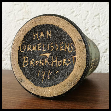 Angelus (Han) Cornelissens is geboren te Wijk aan Zee (Beverwijk) op 23 maart 1935. Over zijn opleiding is weinig bekend. Op zeker moment is hij leerling bij Jan van Stolk in Oosterbeek en raakt hij bevriendt met Jaap Dommisse.. Sinds circa 1965 is hij een succesvol pottenbakker in Bronkhorst. In zijn traditionele zorgvuldig gemaakte pottenbakkerswerk zien wij direct geschilderde motieven als lijnen, vierkantjes en cirkeltjes. Ook worden dergelijke motieven ingekrast, een methode die wij ook bij zijn leermeester Jan van Stolk veelvuldig tegenkomen. Afbeeldingen : Han Cornelissens, portret (bron Artentique); hoge kan (bron Botterweg Auctions Amsterdam); turquoise vaas (bron Catawiki juli 2013); vaas met oor en ingekraste motieven (bron Catawiki juli 2013).