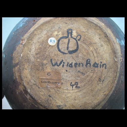 Franz Rudolf Wildenhain is geboren in Leipzig in 1905. Hij volgt de opleiding aan het Bauhaus te Weimar (1925) en voltooit zijn studie te Halle. Hij trouwt met de keramiste / ontwerpster Marguerite Friedländer. Het echtpaar wijkt in 1933 uit naar Nederland, waar zij tot 1940 werkzaam zijn te Putten. Zij noemen hun pottenbakkerij “Het Kruikje”. Marguerite emigreert in maart 1940 naar Amerika. Het was Franz niet toegestaan haar, als een niet-Joodse Duitse burger te volgen. Om aan de Duitse dienstplicht te ontkomen duikt hij onder in Amsterdam en werkt in het atelier van Thera Hofstede Crull. Het atelier in Putten wordt overgedaan aan Willem Stuurman. Van 1940 tot 1947 is Franz tevens docent aan de kunstnijverheidsschool te Amsterdam. Hij woont dan in de P.C. Hooftstraat 53 te Amsterdam. Hier raakt Franz bevriend met de danspedagoge Hans Snoek. In 1947 emigreert Wildenhain naar Amerika en herenigt zich met Marguerite in Guerneville, California (USA). Het atelier dat Marguerite daar heeft gesticht heet ‘Pond Farm Pottery’. Franz beklaagt zich erover dat hij ingezet wordt als vertegenwoordiger van de pottenbakkerij. Hij reist door het westen van Amerika en slaapt in National Parcs. Het huwelijk met Marguerite houdt geen stand meer. Zij zijn teveel uit elkaar gegroeid. Wildenhain verhuist naar Rochester (New York State). Hier richt hij een atelier in en wordt daar ook docent. Hij vertelt Johnny Rolf en Jan de Rooden dat een mens geen drie keer in zijn leven zulke belangrijke (emigratie) stappen kan zetten. Franz Wildenhain overlijdt in 1980 (met dank aan Johnny Rolf voor aanvullende gegevens). Afbeeldingen : Portret uit circa 1935 (bron: fotograaf Maria Oestreicher in Pottenbakkers in Putten, 1999); Pottenbakkerij  ‘T Kruikje, Putten (bron: uit Marguerite Wildenhain and the Bauhaus); Franz Wildenhain bij een pas geopende oven in Putten, ca. 1935 (bron: uit Marguerite Wildenhain and the Bauhausin actie, circa 1953; Franz aan de draaischijf, circa 1953; Marguerite en Franz Wildenhain dragen gedraaide objecten ter droging naar buiten, Putten, ca. 1935 ( bron: uit Marguerite Wildenhain and the Bauhaus); grote vaas met krasdecor van een meermin (bron: Gavelers Amsterdam, 3 december 2012); tabakspot, Putten periode (collectie Grassi Museum, Leipzig); flyer (bron Eja Praasterink).