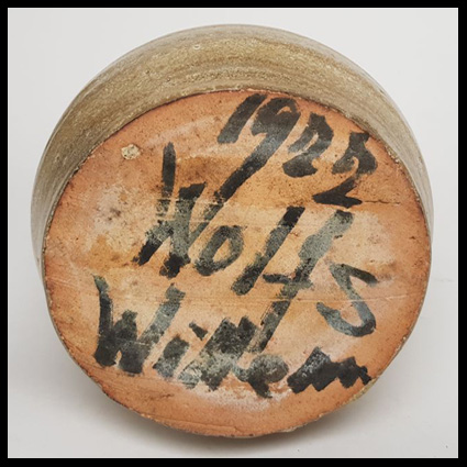 Willem Wolfs is geboren te Ammerzoden (Maasdriel) op 7 maart 1915. Hij volgt de opleiding aan de Koninklijke Academie voor Kunst en Vormgeving te Den Bosch van 1960 tot 1962. Wolfs woont en werkt in Sint-Michielsgestel. In zijn werk spelen zijn negatieve ervaringen uit de Tweede Wereldoorlog door. Hij overlijdt aldaar op 7 februari 2005. Willem Wolfs is beeldhouwer, keramist en schilder. Afbeeldingen : Kop van Willem Wolfs in Sint-Michielsgestel door de beeldhouwster Eveline van de Griend (‘s-Hertogenbosch 1976) uit 2005 (bron www.krogtweb.nl ); vaas, handgedraaid met decoratie, 1922 (bron Catawiki 2018); signatuur van deze vaas.
