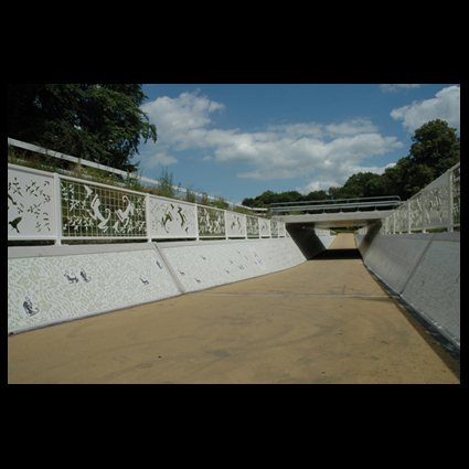 Detail uit de Berenparade , Berenkuil te Utrecht; fiets- en voetgangerstunnel La Vue aan het Leersumseveld te Leersum.