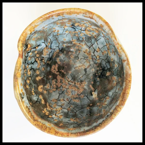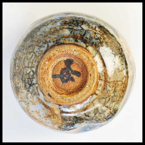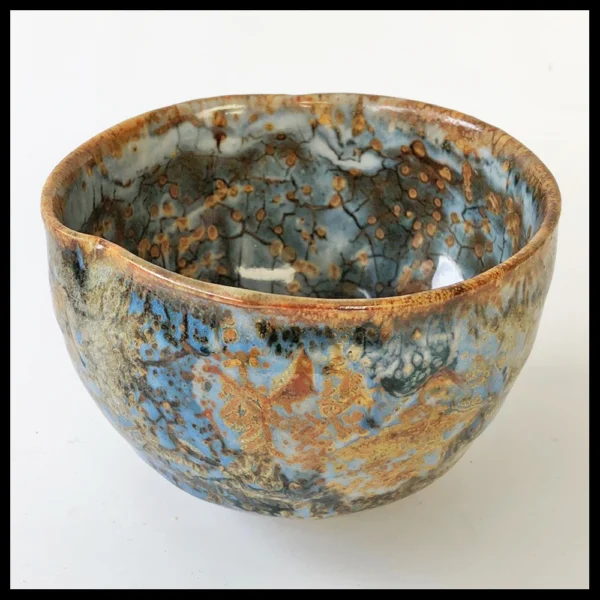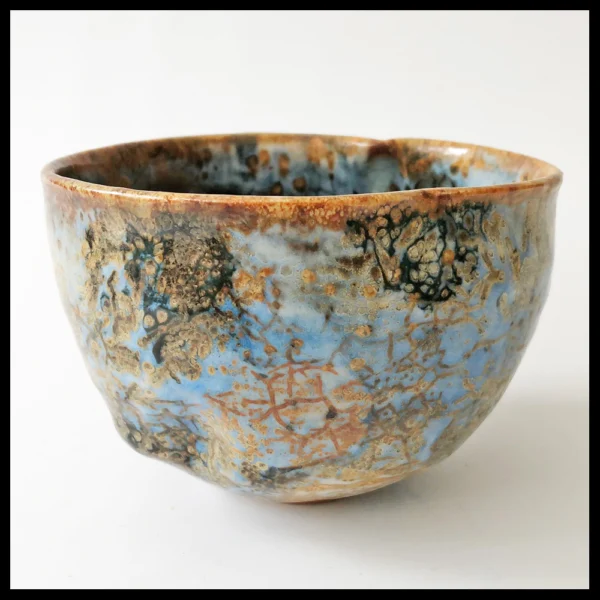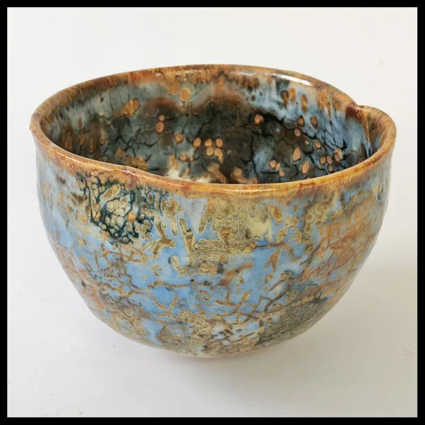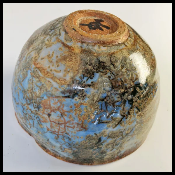 Philippe Dubuc (FR), kleine chawan, zware steengoedklei, op de schijf gedraaid en vervormd, zeer fraaie geaderde glazuren met boventonen in helblauw, bruin en roest, hoogte 8,4 cm, diameter 12,1 cm, 1990-2000s. Provenance: Nederlandse privé collectie.