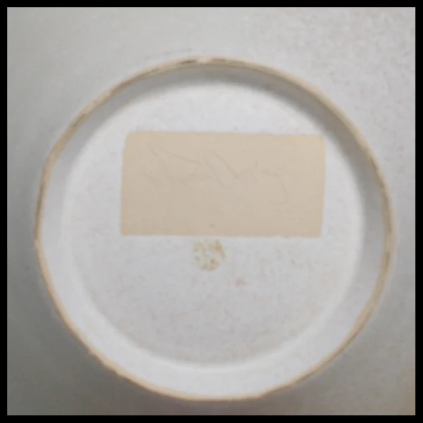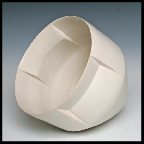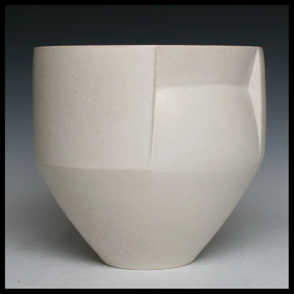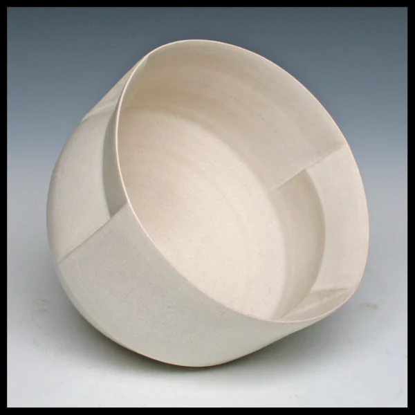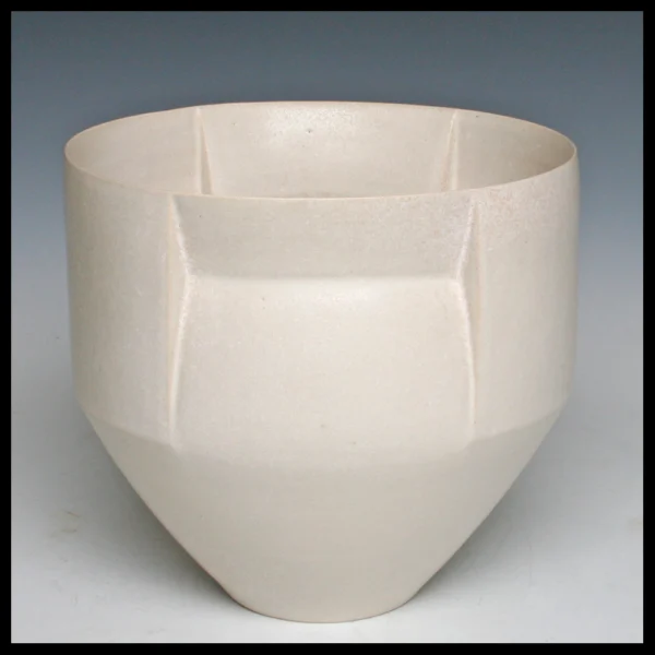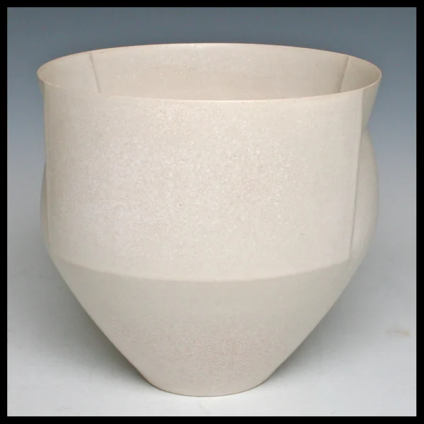 1950 Wouter Dam (NL), pot of container, op de schijf gedraaid en gedeformeerd, onderste helft taps toelopend naar de afgedraaide voet, bovenste helft is verticaal, hierin twee tegenover elkaar liggende naar binnen gevouwen delen, de huid is gepolijst, matte semiglanzende gebroken witte levendige glazuur, prachtige klank, hoogte 20 cm, diameter 21,3 cm, 1987. Provenance: Nederlandse privé collectie.