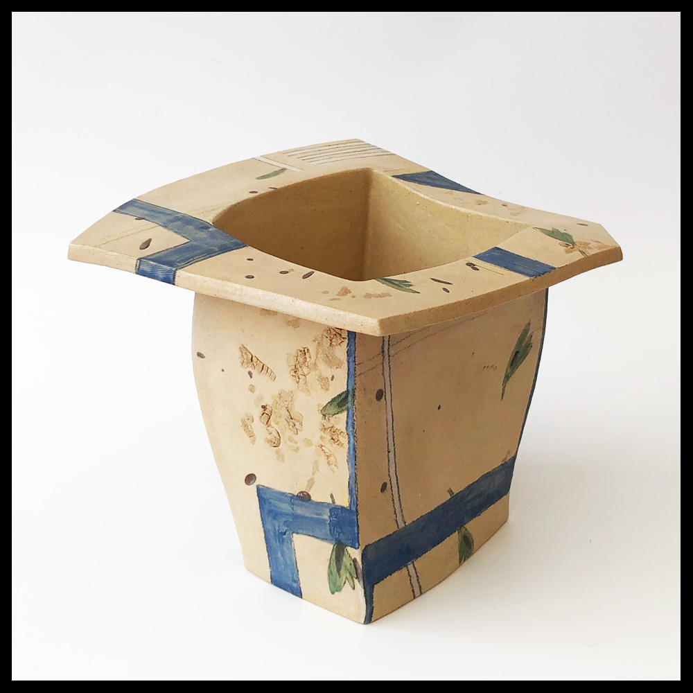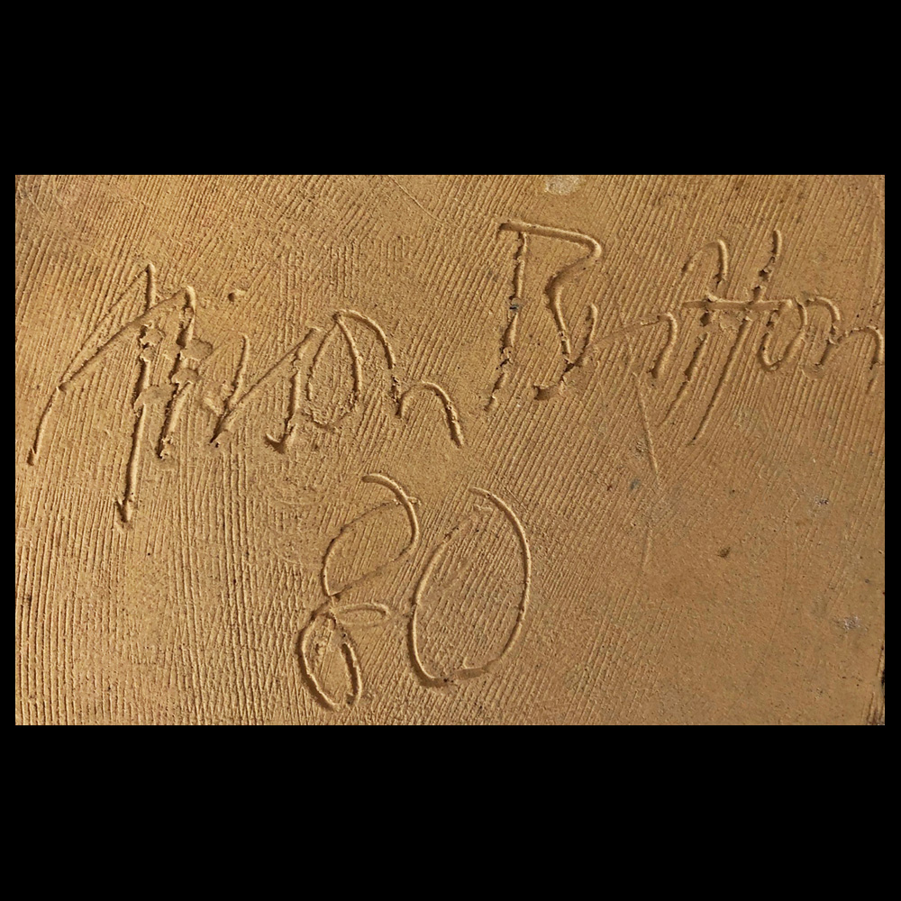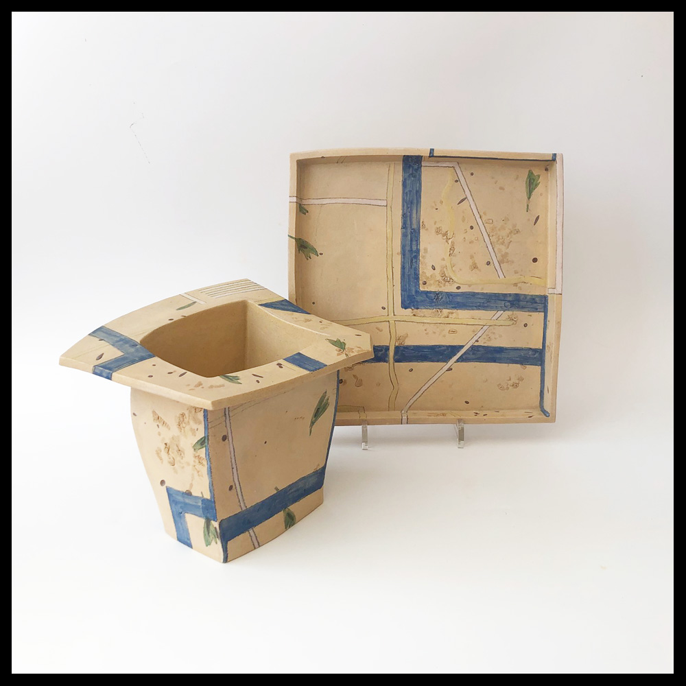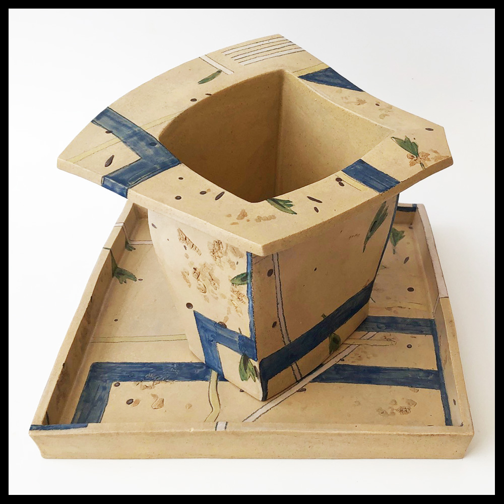 Alison Britton (UK), een zeldzame set van een middelgrote container met een vierkant bord, beide uit platen lichtgeel bakkende klei opgebouwd, met lijndecoraties en met fragiele tekeningen zoals bladmotieven, kenmerkend voor haar vroege werk, afmetingen bord 29,5 x 29,5 x 2 cm, afmetingen container 19 x 23 x 21,5 cm, ingekraste signatuur en datering, 1980. Dit ensemble is door de eerste eigenaar aangekocht bij Galerie Kapelhuis in november 1980 te Amersfoort (NL).