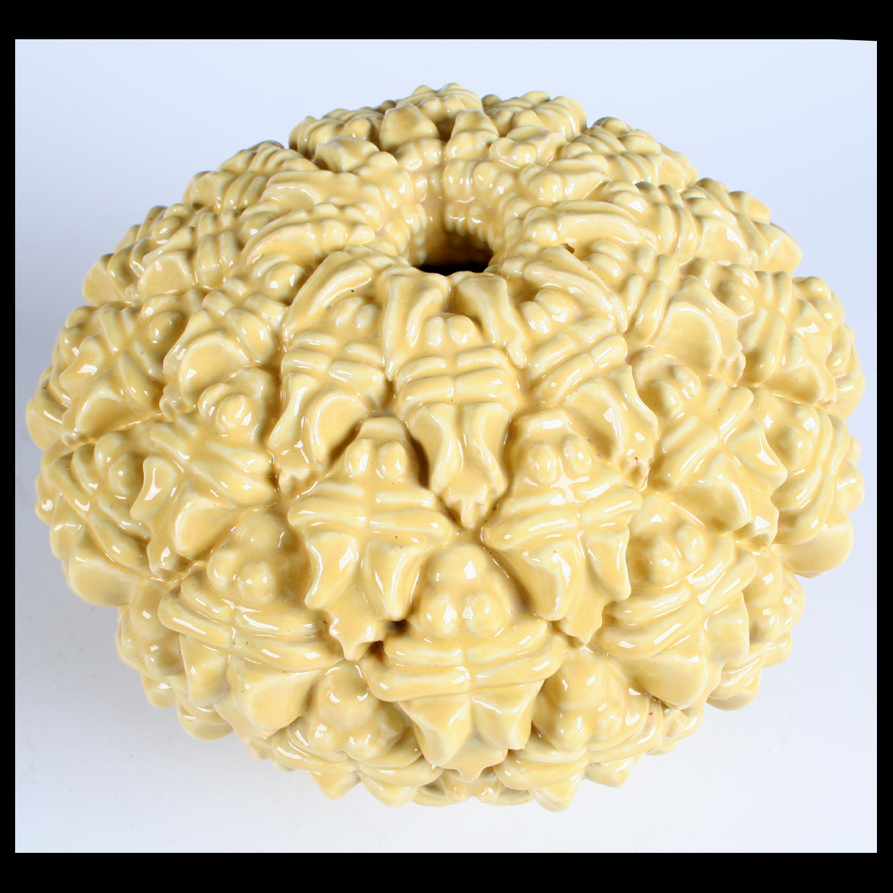Andrea Boerman (NL), “Scarabee pot” als een hommage aan de Egyptische cultuur, handgevormd van scarabeeën in diverse vormen en grootte, gemonteerd op een onderpot, steengoed, gele hoogglans glazuur, onderzijde licht bijgeslepen, hoogte 18 cm, diameter 21,4 cm, 1995. Provenance: collectie Fuchs.