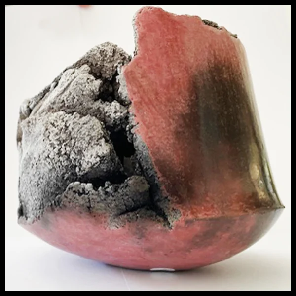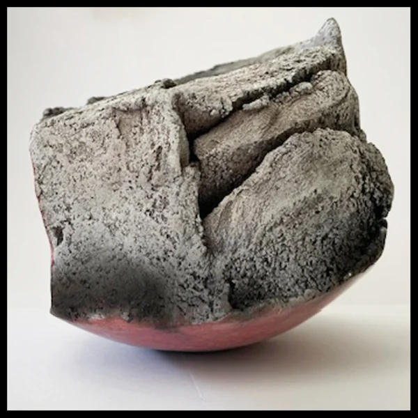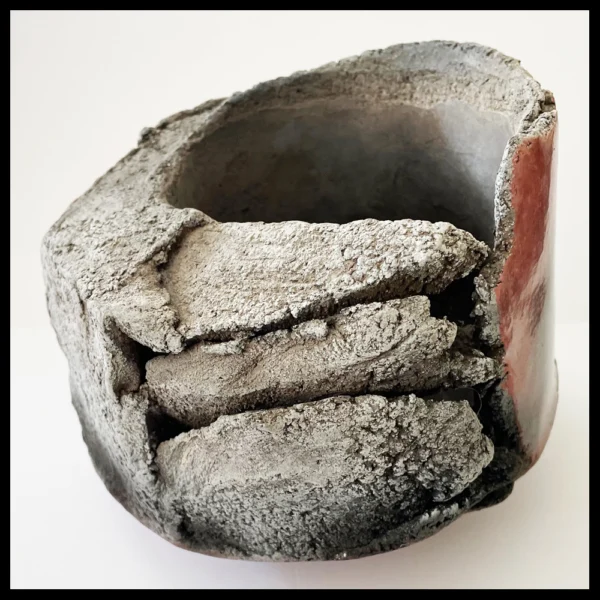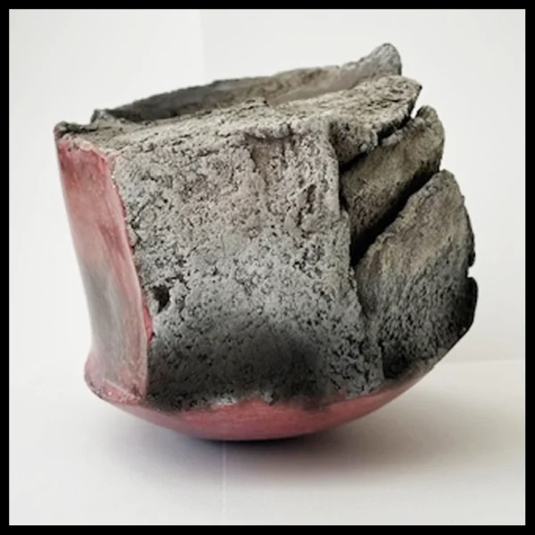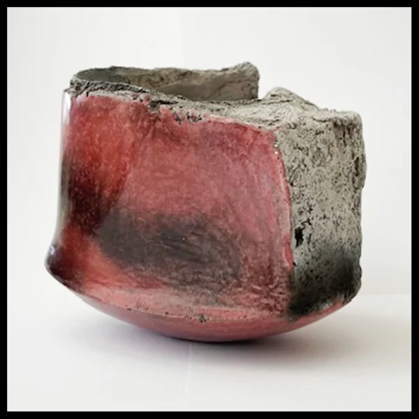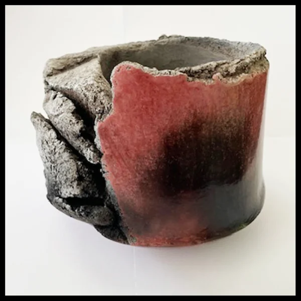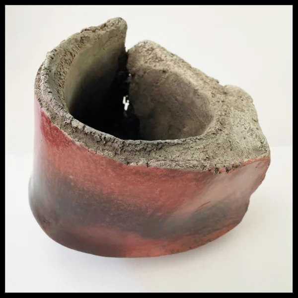 Anne Bulliot (FR) – ‘gebeeldhouwde’ container, lava vs. burnish. Het gaat om een heel zware en ‘gebarsten’ kom, deels met een lava uiterlijk en deels met een gepolijste fraaie donkerrode huid. Hoogte 13 cm, breedte 14,4 cm, ingekraste signatuur, 1995-2000.