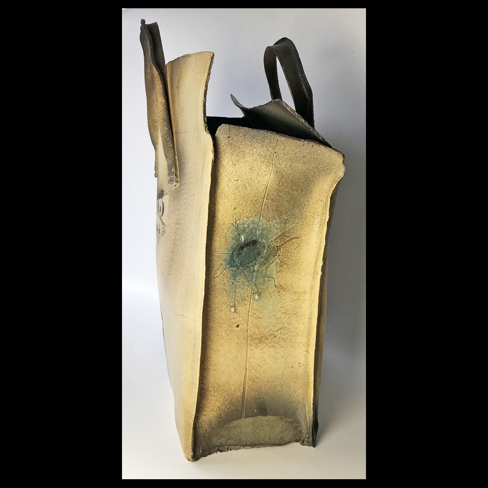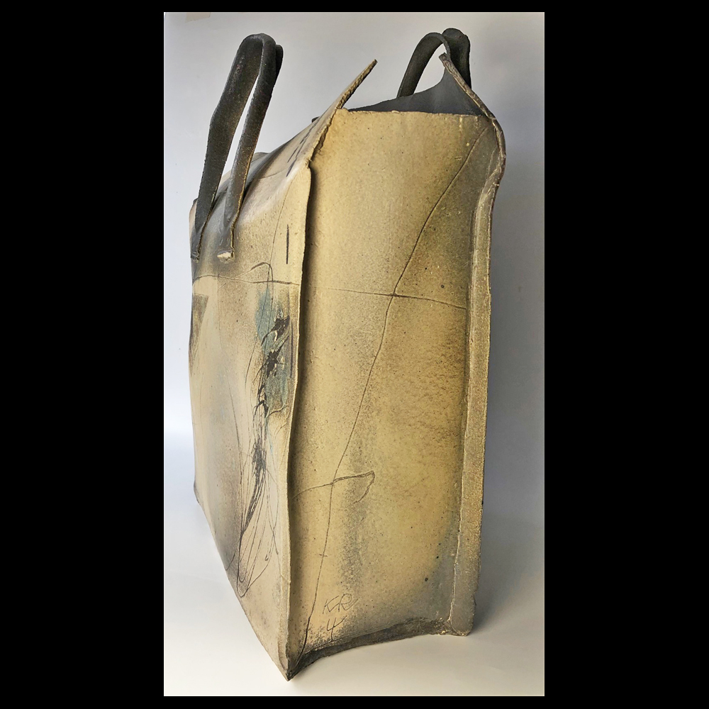 Kees (Ben) van Renssen (NL), boodschappentas, verwijzend naar het transport tijdens de Shoah , uit platen klei opgebouwd, lichtgekleurde scherf, met decors, waaronder het nummer van een gedeporteerde, hoogte 52 cm, breedte 43 cm, diepte 26 cm, circa 1983.