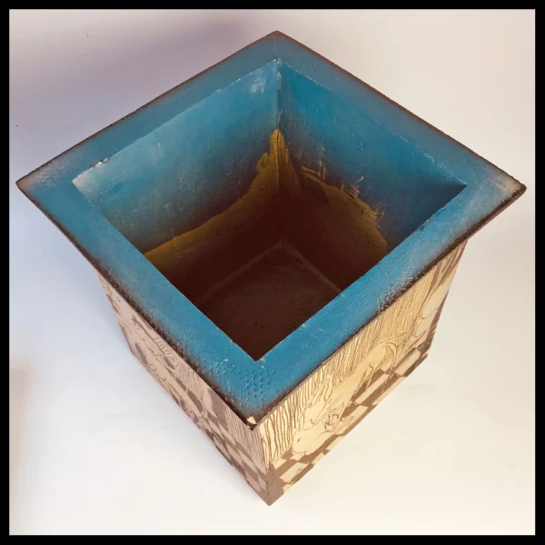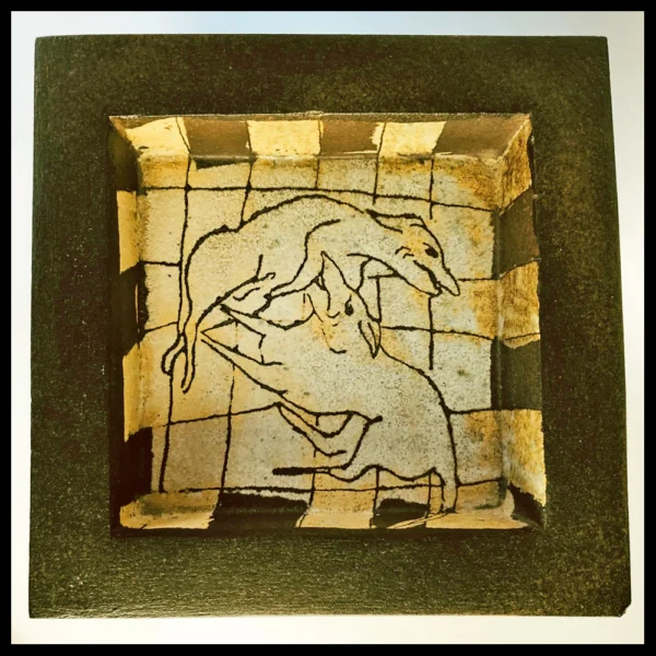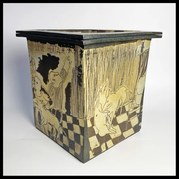 Lies Cosijn (NL), uit platen klei opgebouwde vierkante dekseldoos met de tekst “Lieve Herta”, met verzonken deksel, ingekraste decors met bang gemaakte mensen voor de hond Herta, op de deksel twee liggende honden, hoogte 29 cm, circa 1988. Aankoop door de eerste eigenaren bij Galerie Aelbrecht, Delfshaven.