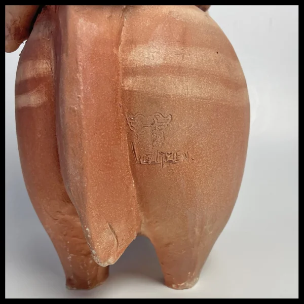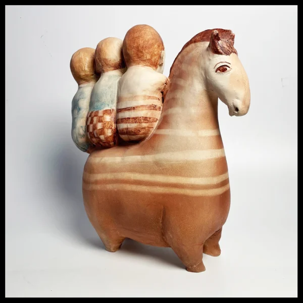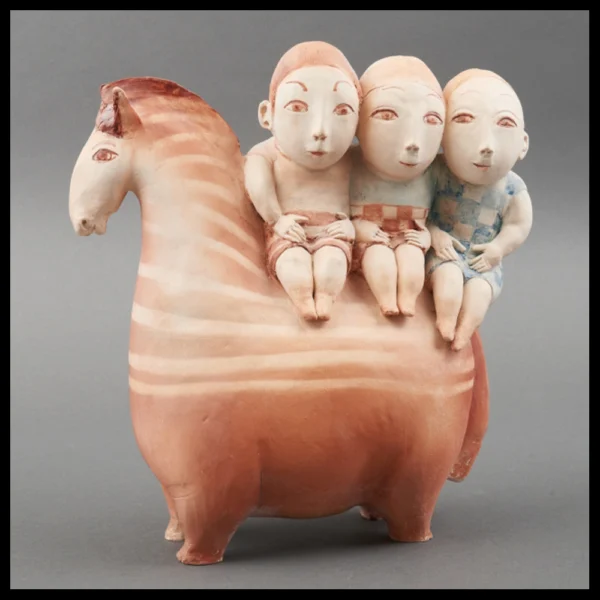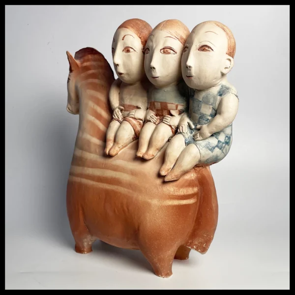 Lies van Vlijmen-Ram (NL), drie figuren op een paard, met de hand geboetseerd, gekleurd met kleur engobes, hoog 33 cm, kunstenaarsstempel, 1990-2000.