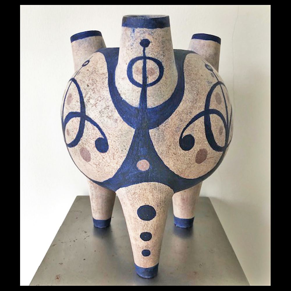 Louis Manche / Marlies Diels-Schnauck, gedragen kom met 3 tuiten, gedraaid en gemonteerd door Marlies Diels-Schnauck (DE), decor Louis Manche (NL), gekleurde engobes, hoogte 31 cm, diameter 24,5 cm, 1960-1970s.