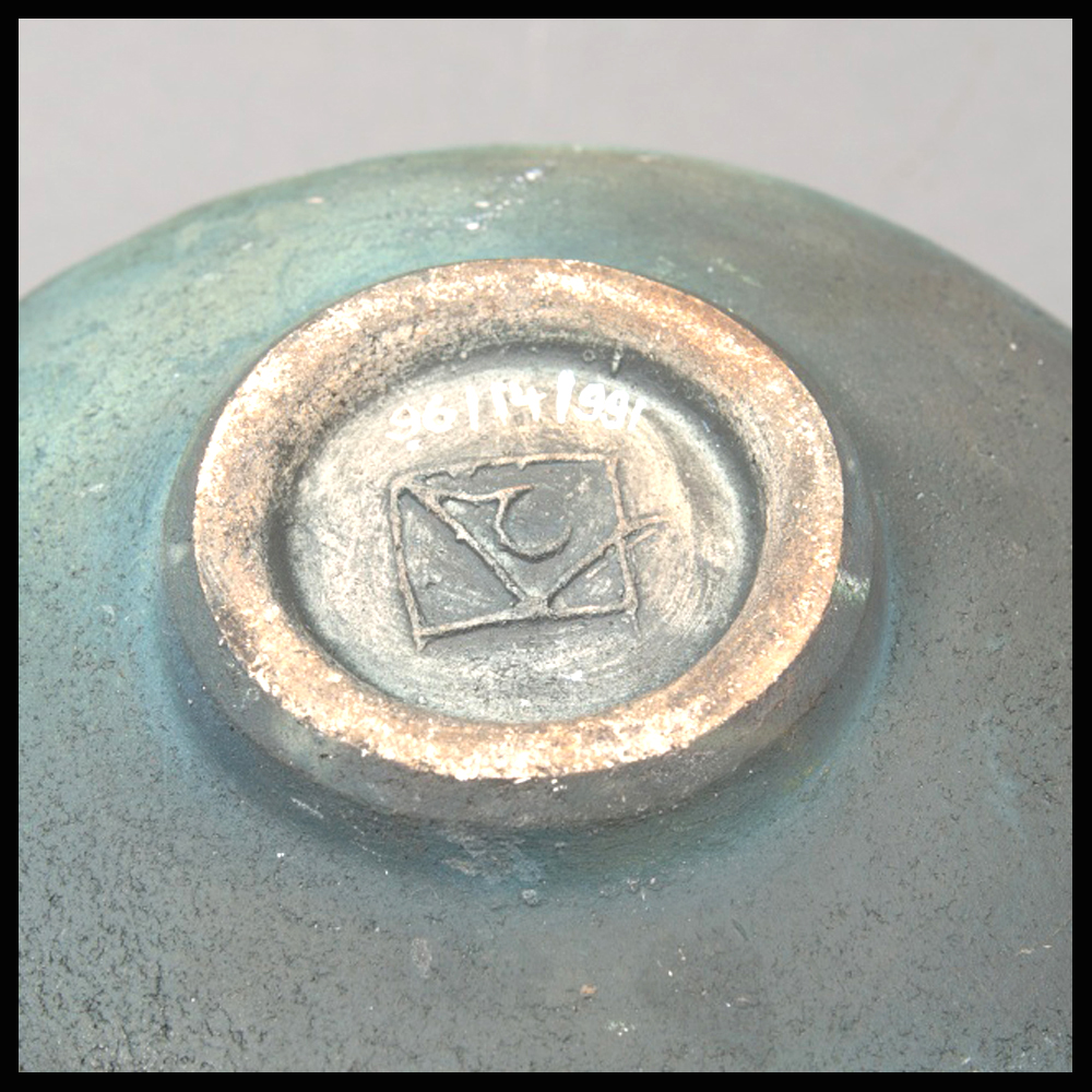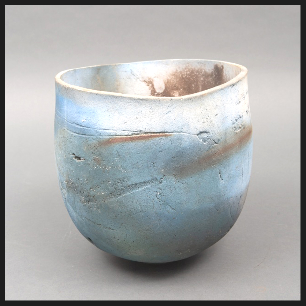 Rik Vandewege (BE) – ronde container die opgebouwd is uit een kleiplaat. In het begin bewerkt de kunstenaar het oppervlak van de kleiplaat, wat leidt tot gaten, ruwe plekken en krassen. Nadat de kleiplaat de vorm van een vat heeft gekregen, wordt er een gedraaide voet als bodem gemonteerd. De matte huid is gekleurd met blauwe, groene, bruine en witte engobes, hoogte 22 cm, diameter 22,2 – 23,5 cm, hoogstwaarschijnlijk gedateerd 1991 (zie foto hieronder). Dit object is door de eerste eigenaren aangekocht bij Galerie Carla Koch te Amsterdam.
