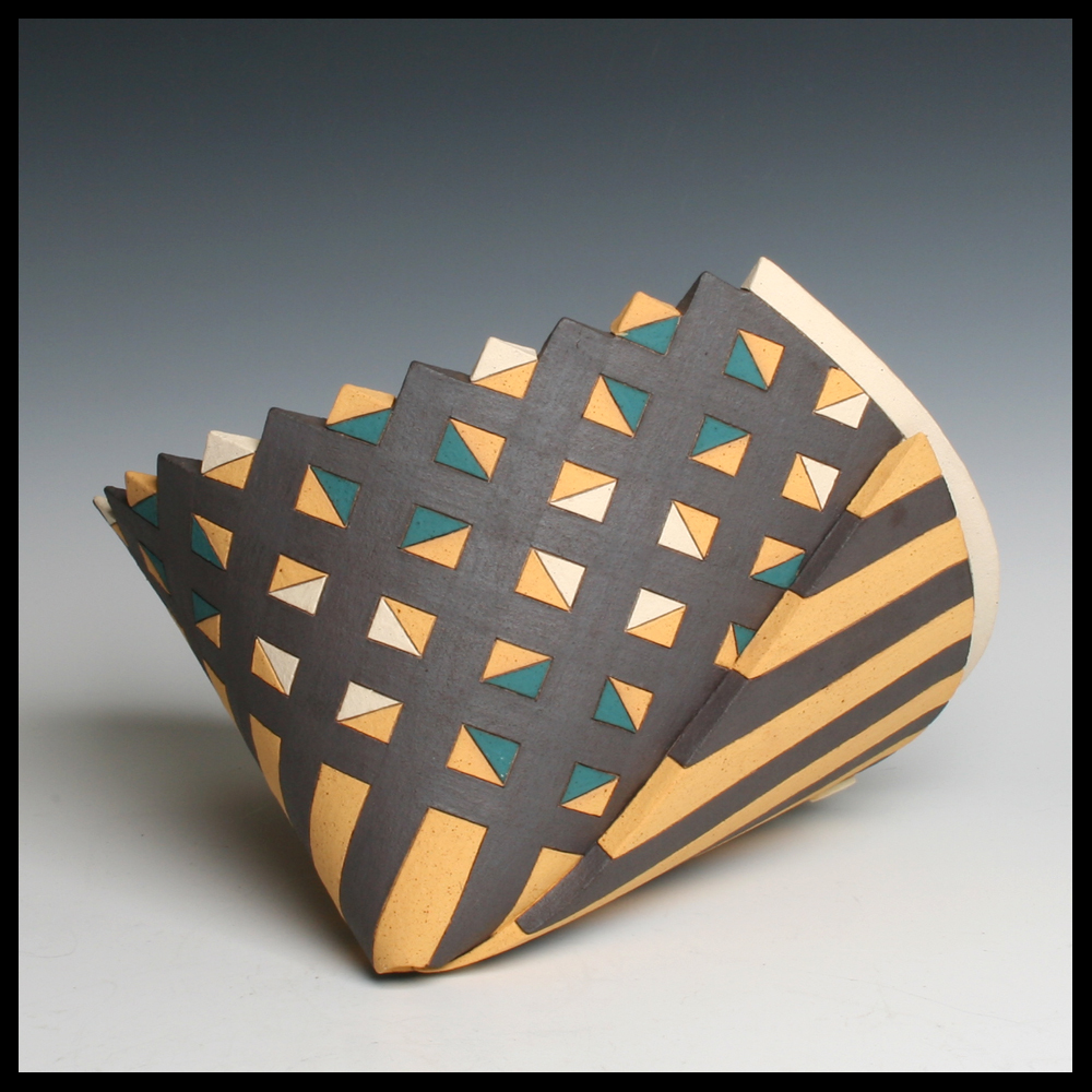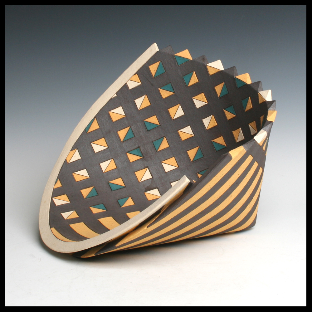 Rita Ternes (DE), dynamische gevouwen en gedecoreerde keramische plaat, getiteld ‘Gefaltene Platte I, steengoed, ingesneden geometrische lijnen opgevuld met gepigmenteerde engobes, hoogte 24 cm, diameter 27 cm, 1993. Dit object werd door de eerste eigenaren aangekocht bij Atrium Galerie Vromans in Amsterdam.