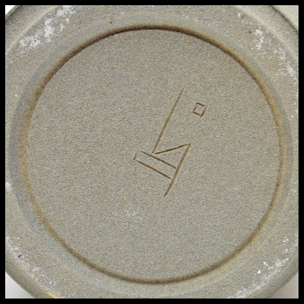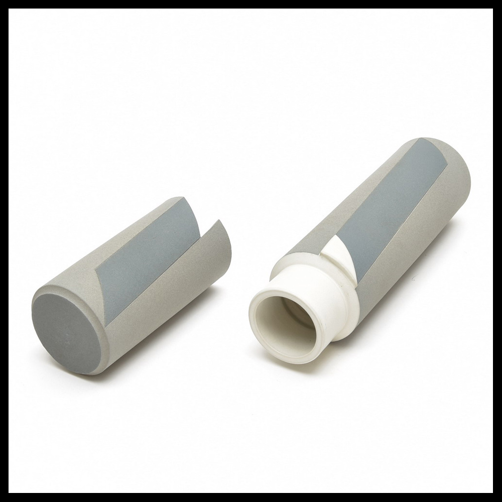 Kyra Spieker (DE), hoog kokerobject dat bestaat uit twee delen die perfect in elkaar schuiven, op de schijf gedraaid, steengoed, lichtbakkende scherf, interieur wit geglazuurd, buitenzijde ruw mat geglazuurd in midden grijs, aan de voorzijde een licht diagonale ingekraste baan in donkerder grijs, aan de bovenkant van het onderste deel eindigend in een wit geglazuurde opliggende driehoek dat uiit het bovenste deel is weggesneden, , hoogte 40 cm, diameter 7,5 cm, 1991. Dit object is door de eerste eigenaren aangekocht bij Galerie Ewers te Keulen.