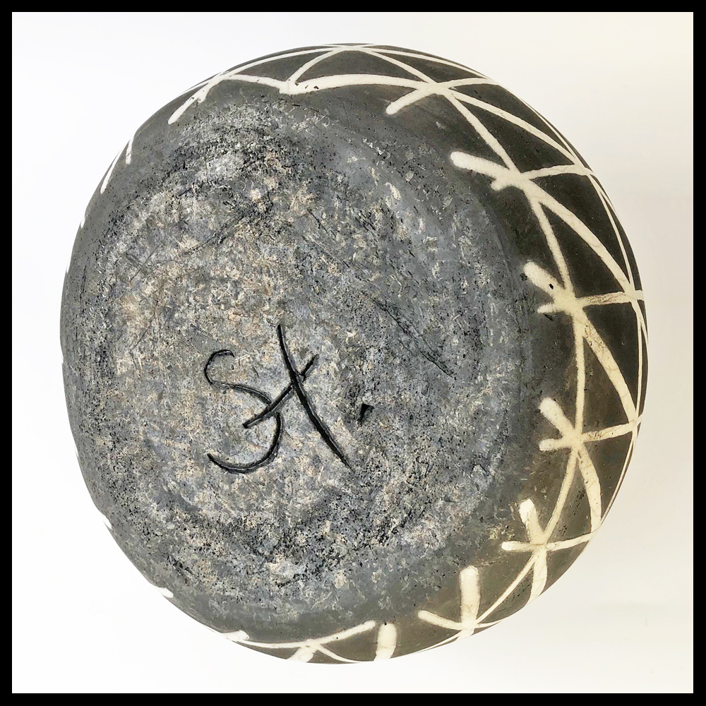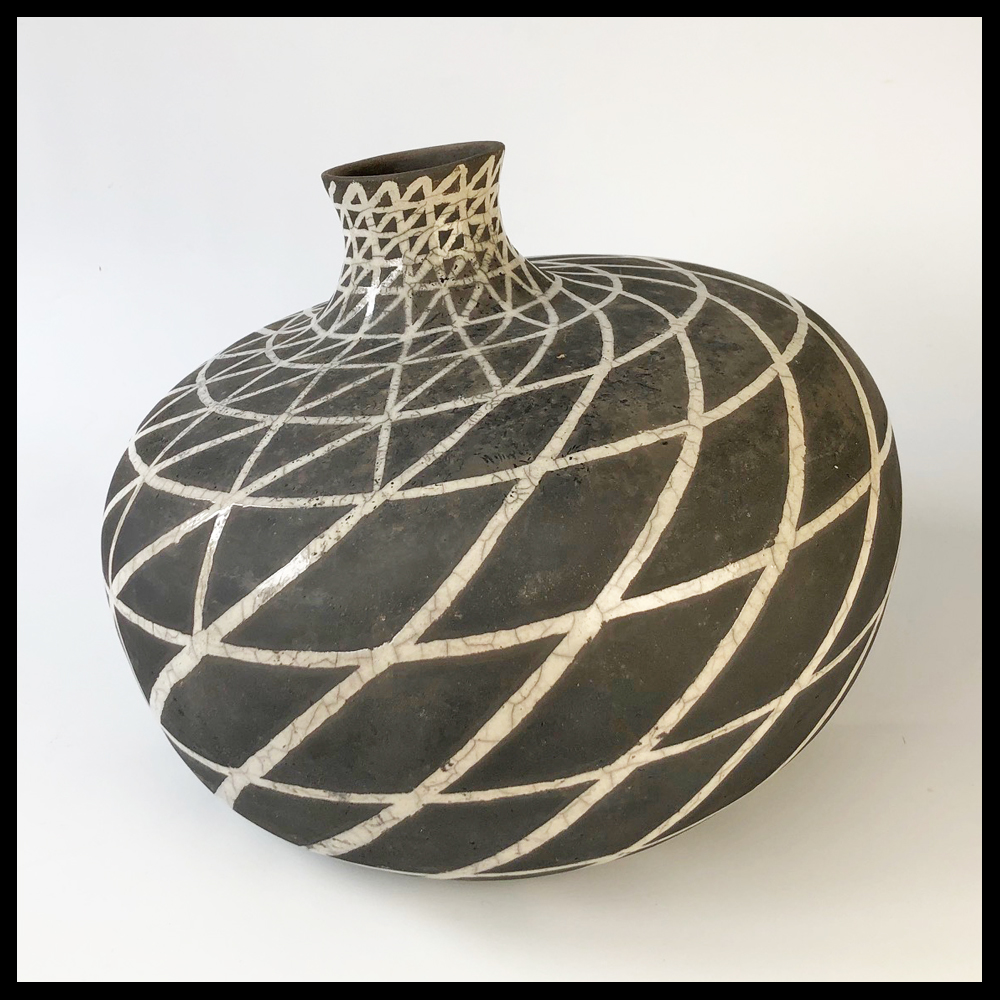 Susan Haag (NL), gedeformeerde vaasvorm, Raku gestookt, met geometrisch patroon, de lijnen zijn verglaasd, de niet geglazuurde delen zijn door de RAKU stok tussen bruin en zwart uitgevallen, hoogte 18,8 cm, diameter 25,3 cm, ingekerfde signatuur, 2005. Provenance: collectie Wim Korink.