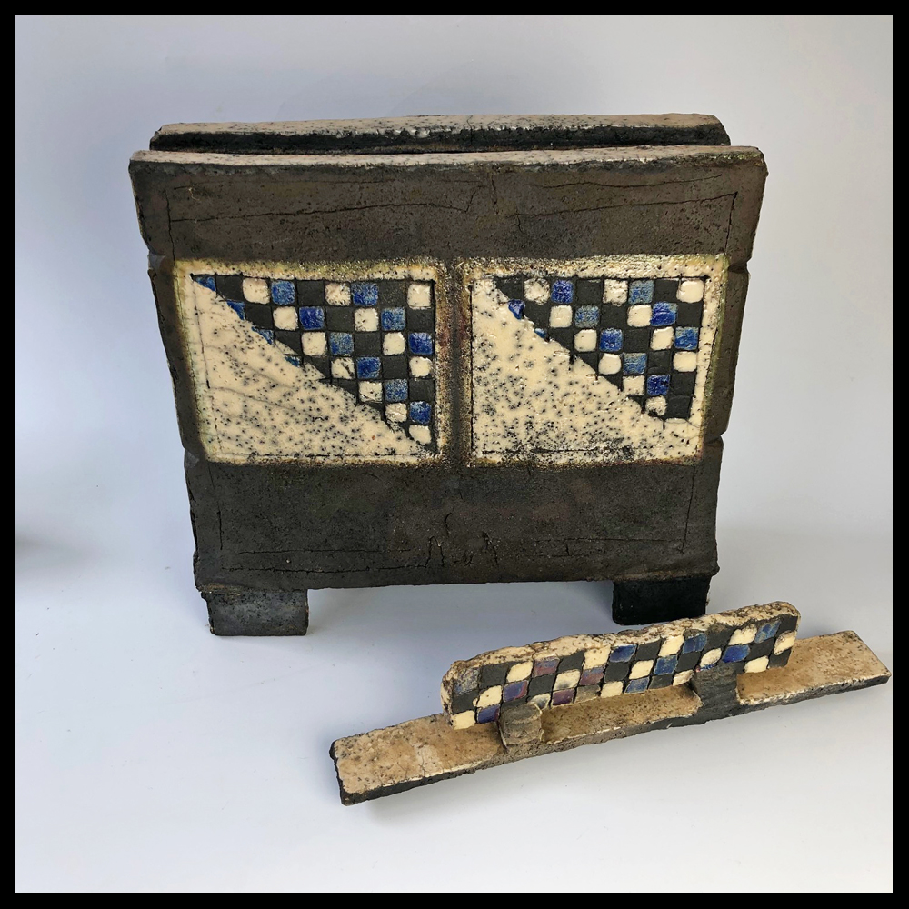 Susanne Silvertant (NL), grote rechthoekig dekselobject op voetjes, RAKU gestookt, zijden groen geglazuurd, voor- en achterzijde met een identiek wezen/blokjesdecor, deels geglazuurd, hoogte 31,4 cm, breedte 27,8 cm, diepte 11 cm, ca. 1992.