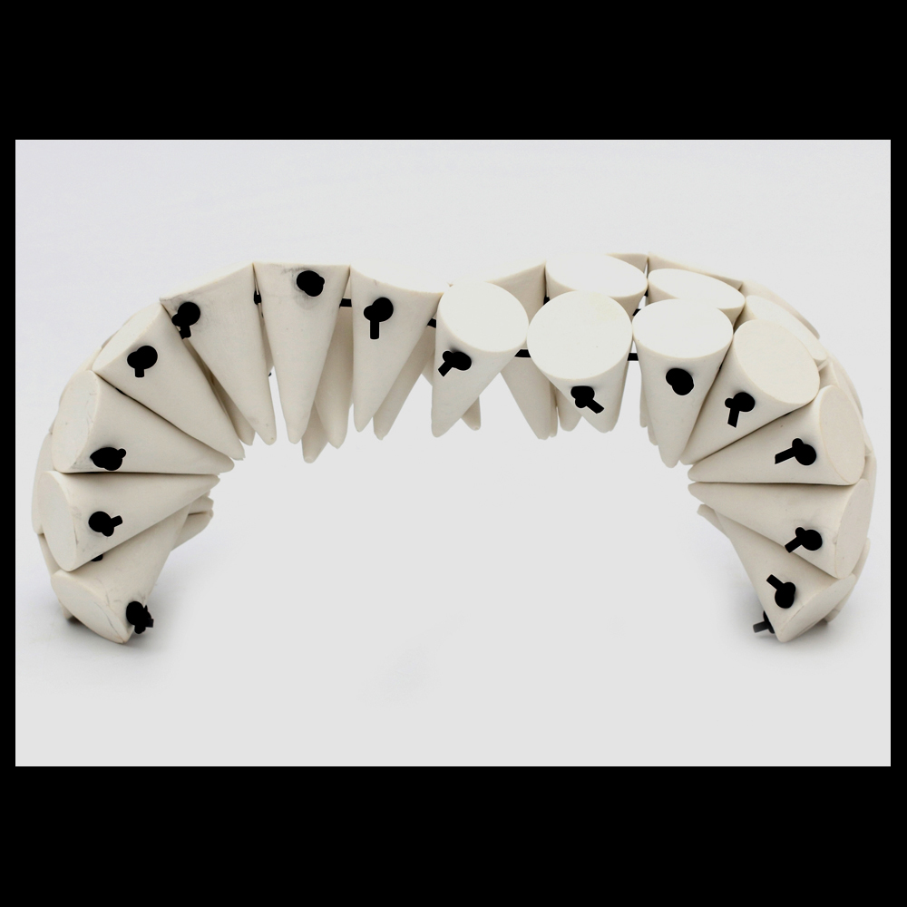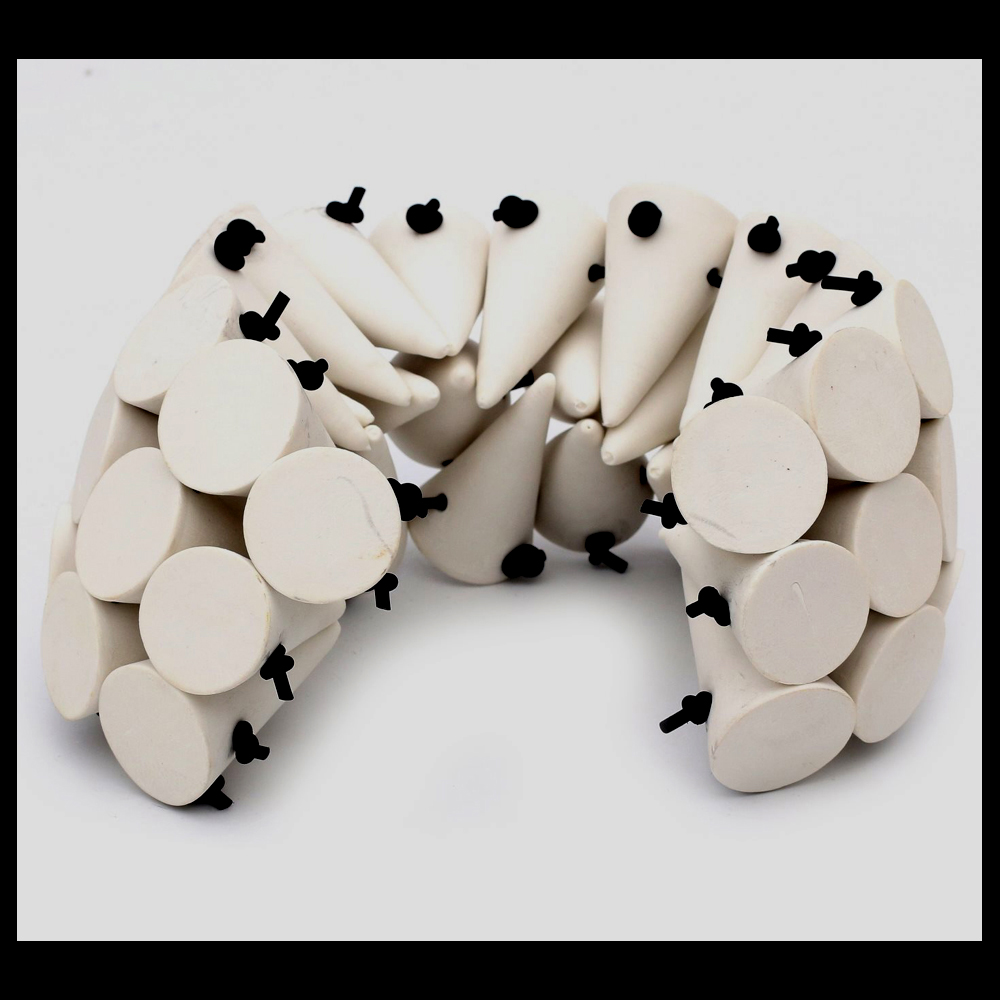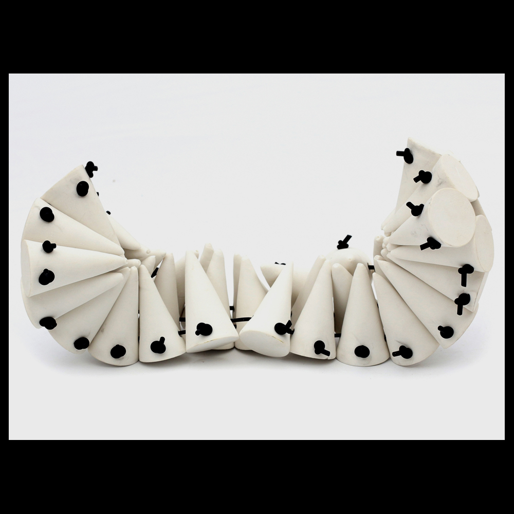 Ursula Commandeur (DE) – een kegelvormige sculptuur getiteld ‘Gewinde / Draad’, 42 kegelvormen in lengte en breedte met rubberen koord, gegoten, porselein, elke kegel heeft twee gekruiste ogen, geen handtekening, 2010, hoogte 10 cm, breedte 46 cm. Foto van Ursula Commandeur met een vergelijkbaar beeld (Bron Münsterland Zeitung).