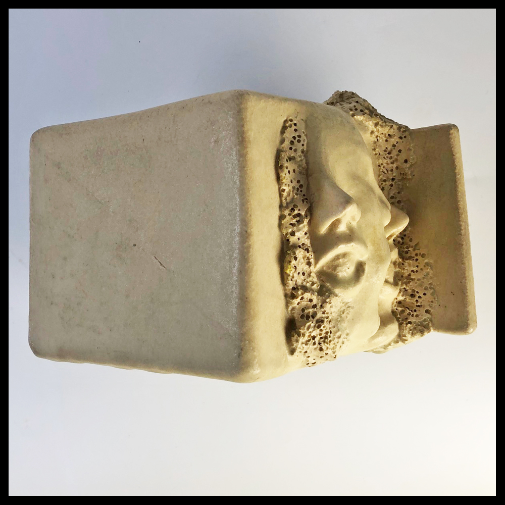 Wim Verhagen (NL), blokplastiek met drie gezichten, met de hand gemodelleerd, lichtgele glazuur, hoogte 15,5 cm, lengte 21,2 cm, diepte 15,2 cm, datum 67-8-11, sticker met naam kunstenaar, 1967.