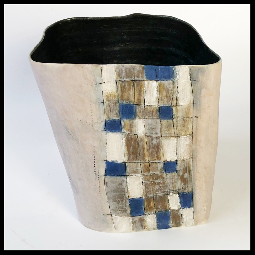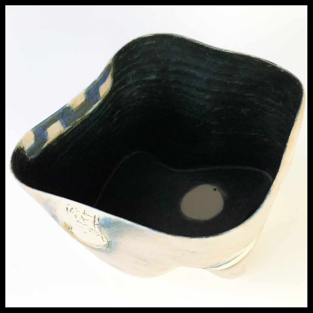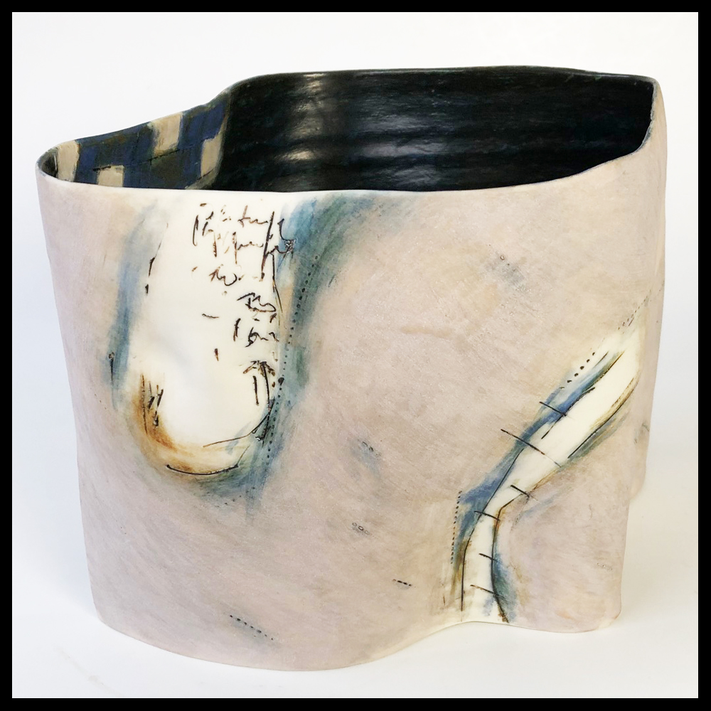 Yuk Kan Yeung (HKG/NL), keramische gewelfde vorm, op een matte beige-roze ondergrond zijn diverse decoraties geschilderd en ingekrast, die doen denken aan een dromerige reis van de keramiste, het interieur is blauw-groen gevlekt met een overloop naar binnen van het blokdecor, op de donkere bodem een witte uitgespaarde vlek, hoogte 14,2 cm, breedte 18,8 cm, 2000s.