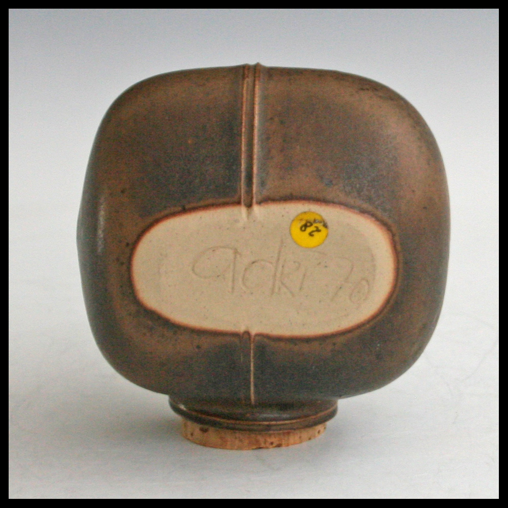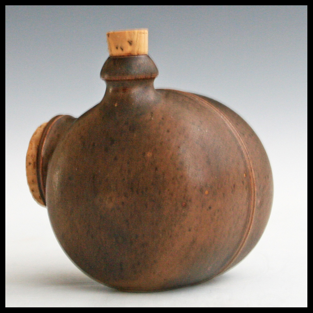 Adriana (Adri) Baarspul (NL), klein jeneverkruikje, steengoed, in delen gedraaid en vervplgens gemonteerd, achter de grote kurk een ruimte voor een steengoed bekertje, achter de kleine kurk een vulmond, bruine semi matte glazuur, hoogte totaal 11, 3cm, breedte 10 cm, diepte 10,5 cm, 1970.