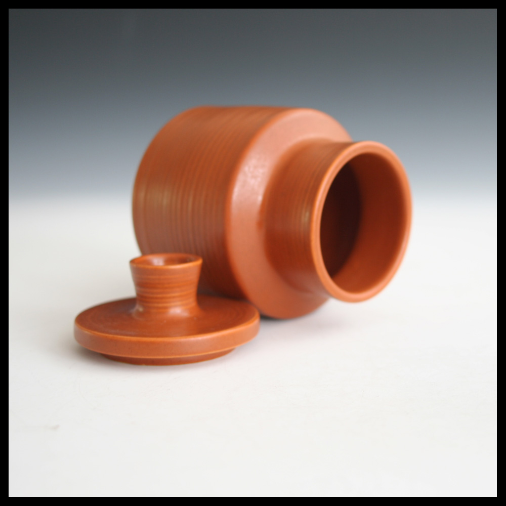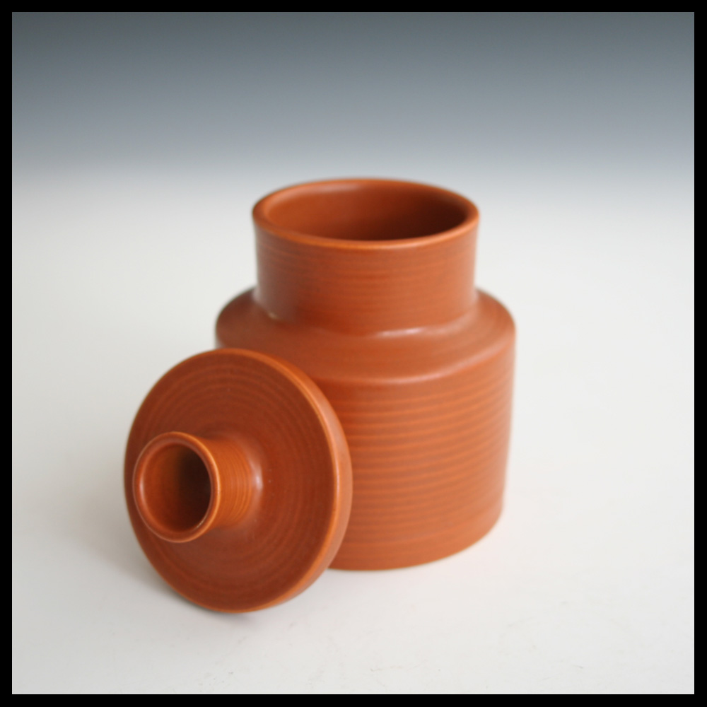 Annikki Hovisaari voor Arabia (FIN), handgedraaide dekselpot met ribeffect, fraaie matte oranjerode glazuur, hoogte 14,5 cm, diameter 10,5 cm, circa 1960-1965.